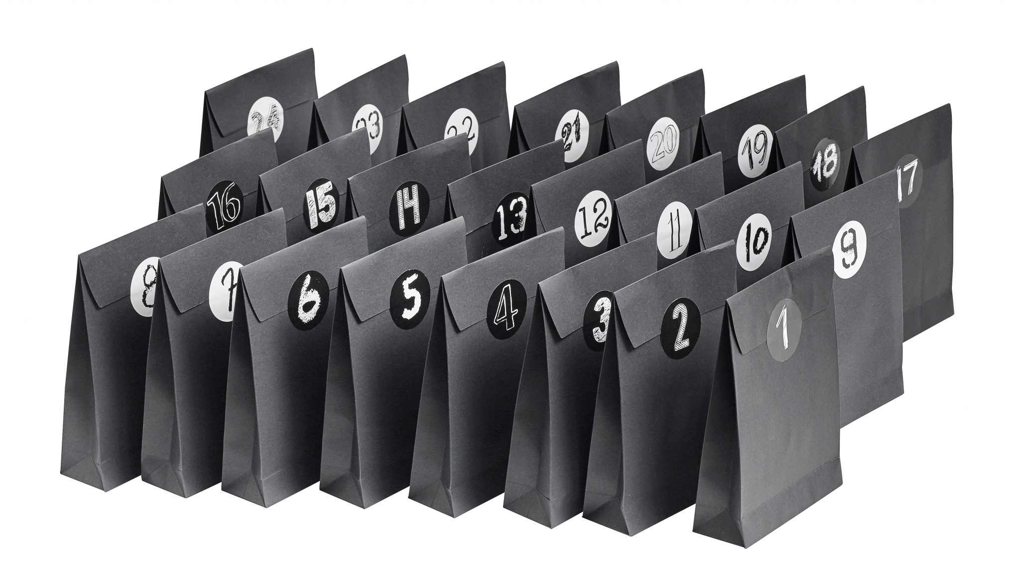 Dekorativ adventskalender, med 24 stk sorte papirposer med klistremerker med tallene 1-24.