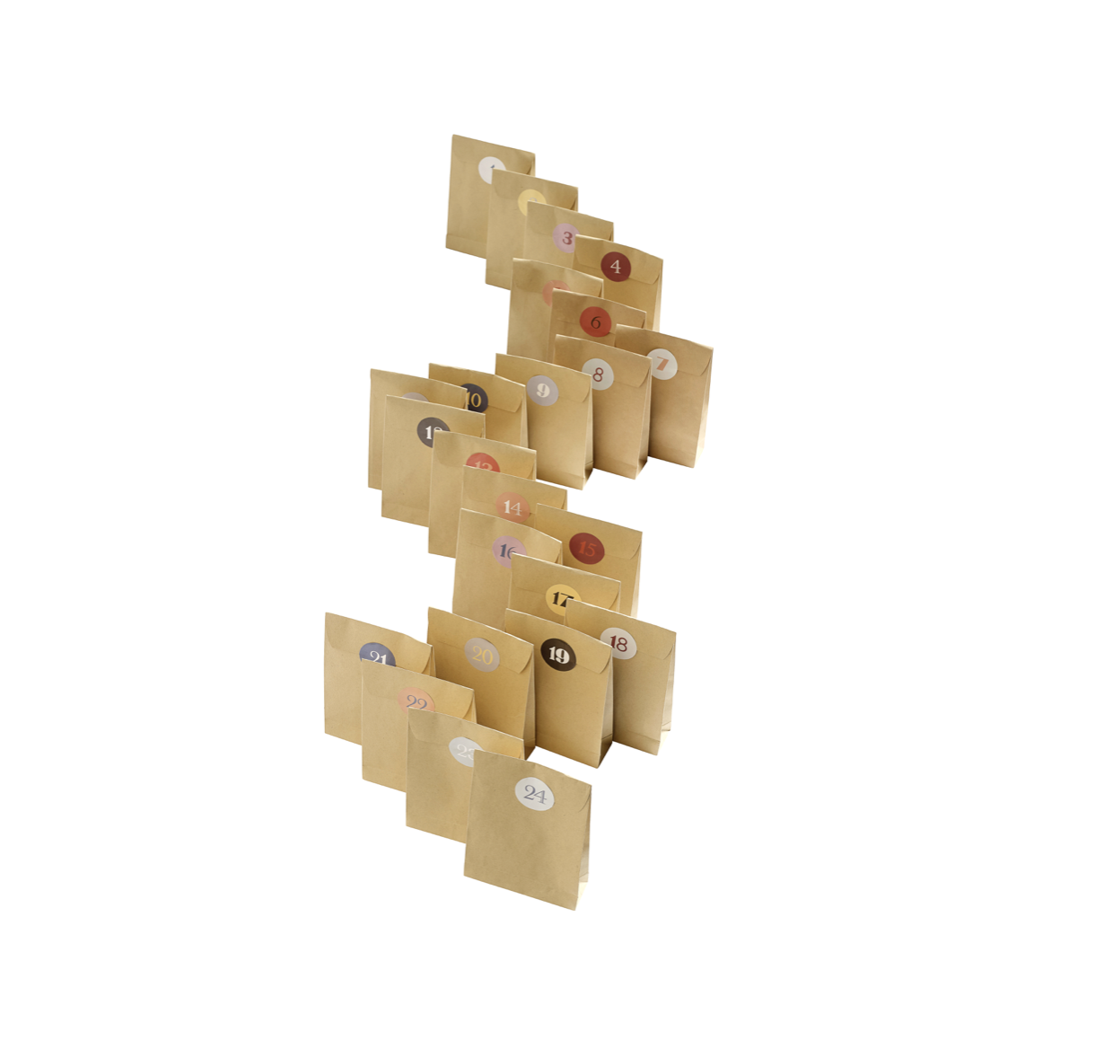 Dekorativ adventskalender, med 24 stk papirposer. Det følger med klistremerker med tallene 1-24.