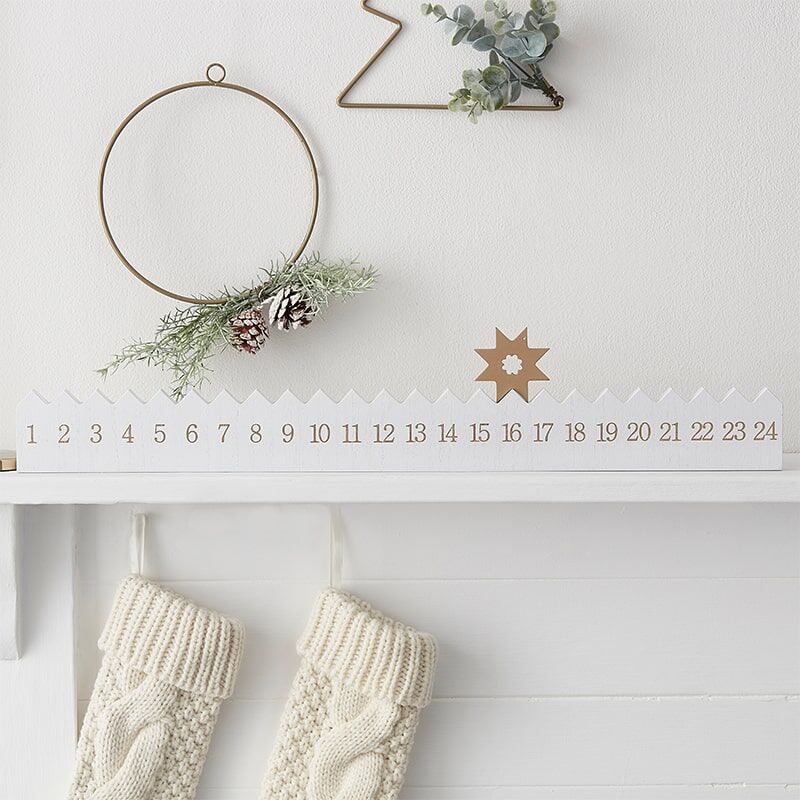 Nyt spenningen hver morgen når du flytter trestjernen til neste hakk og teller ned dagene til nissen kommer på besøk. Denne tradisjonelle designet vil aldri eldes og vil være perfekt år etter år. Kalenderen er klassisk og tradisjonell i hvitt og gull og passer til ethvert skandinavisk eller rustikt tema.