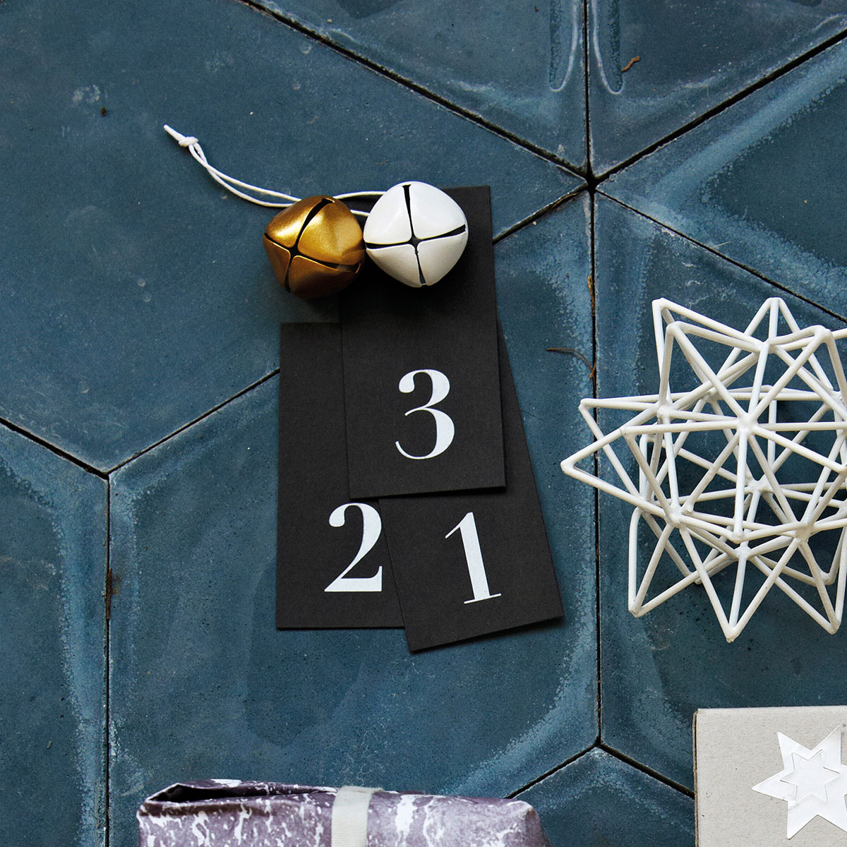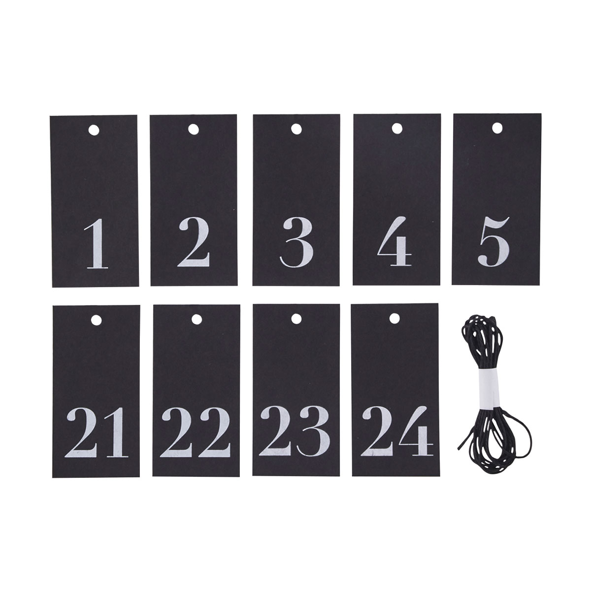 Stram og stilren adventskalender, sort papp med hvite tall.