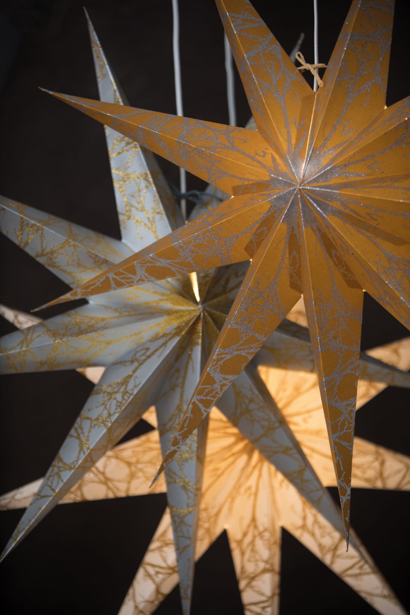 Eksklusiv papirstjerne med mønster i gull og sølv.