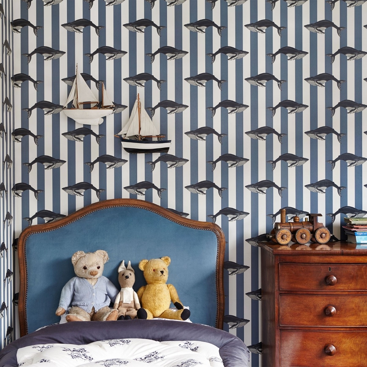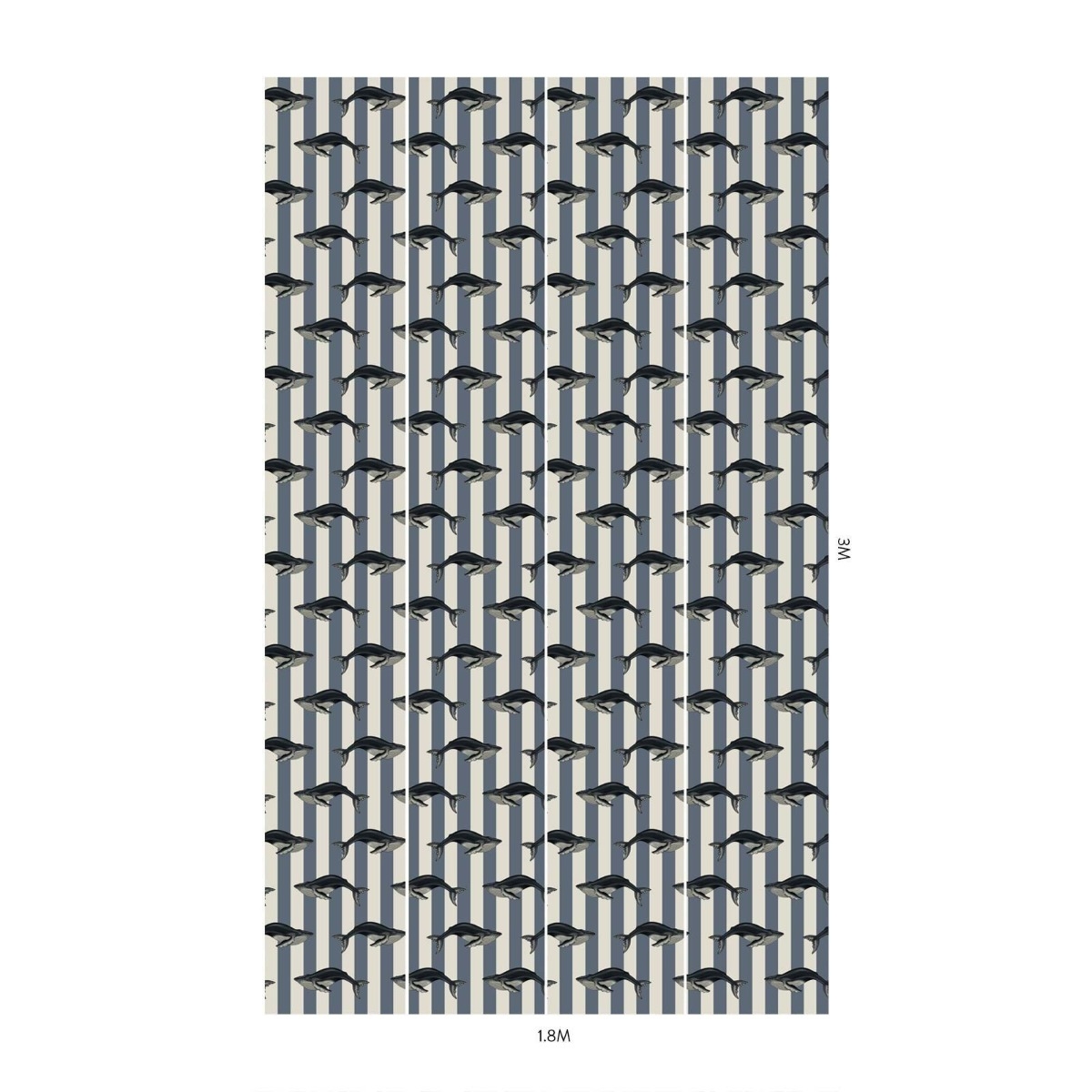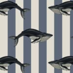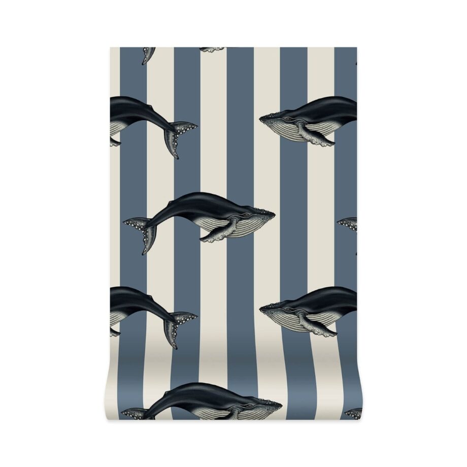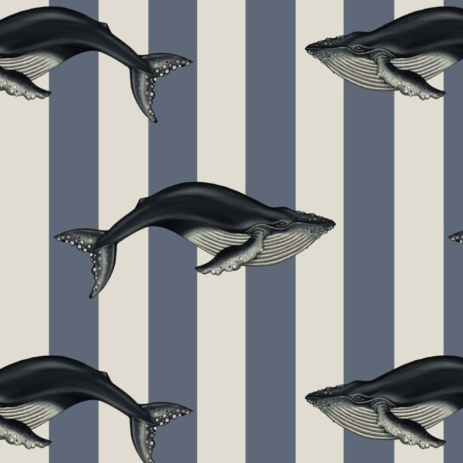Baleana, inspirert av Art Deco med vår forkjærlighet for dyreverdenen. En tapet med hvaler, med en stripet bakgrunn.