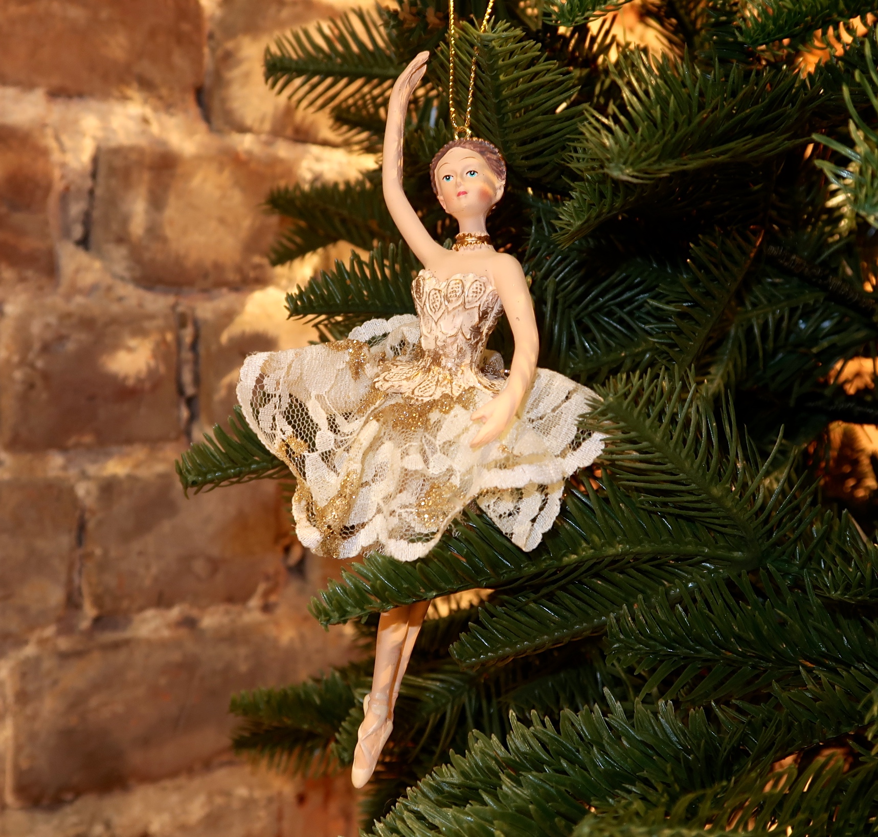 Dekorativ ballerina med blonde skjørt med gull glitter og paljetter.