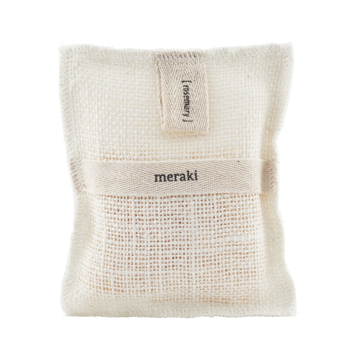 Gi huden din en skånsom peeling når du vasker med denne fantastiske badehansken fra Meraki. Badehanske er laget av 100% jute og er fylt med skånsom, håndlaget såpe som skummer opp når du vasker kroppen. Såpen har en nydelig aroma av rosmarin og inneholder nærende og essensielle oljer.