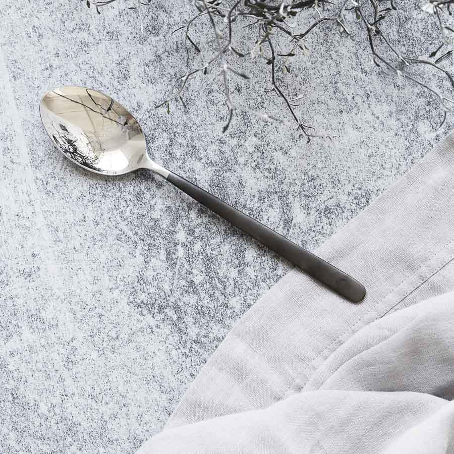 Skje i rustfritt stål fra Ox-serien til House Doctor. Perfekt hverdagsbestikk, med skaft i mørk titanium. Kan vaskes i maskin,