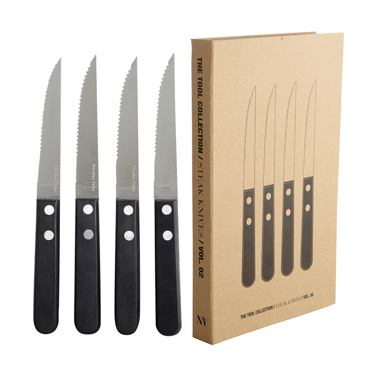 Biffkniven er laget av rustfritt stål og treskaft. En skarp kniv som er det perfekte verktøy til en god biff middag, kommer i sett á 4 stk i en flott gaveeske. Anbefales håndvask.