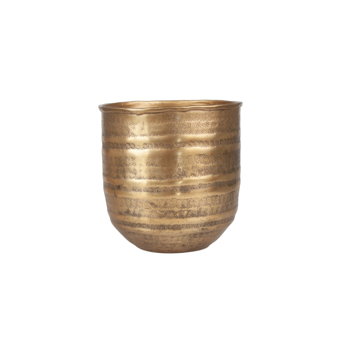 En stilren blomsterpotte i banket aluminium som er forgyllet. Superfin med en grønn plante i, og kul i kombinasjon med andre potter for et spennende look.