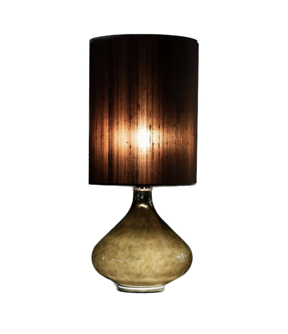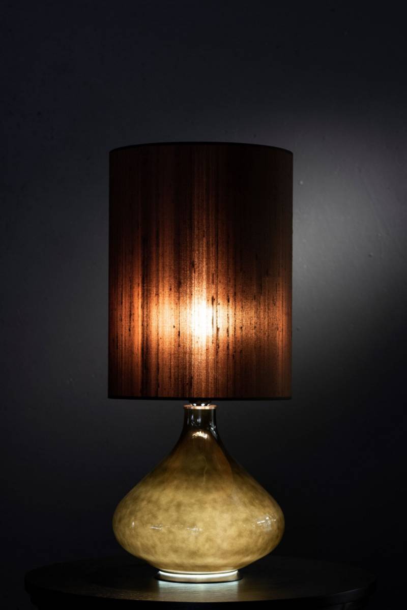 Håndlaget lampefot i glass fra spanske Thawaru med lys i foten. Alle er håndlaget og de kan derfor variere litt i fargen når lyset i foten er tent, fra lysere- til mørkebrun. Når lyset i foten ikke er på ser lampefoten sort ut. Lampefoten lyser når skjermen tennes, man kan velge å skru av skjermen slik at kun foten lyser.