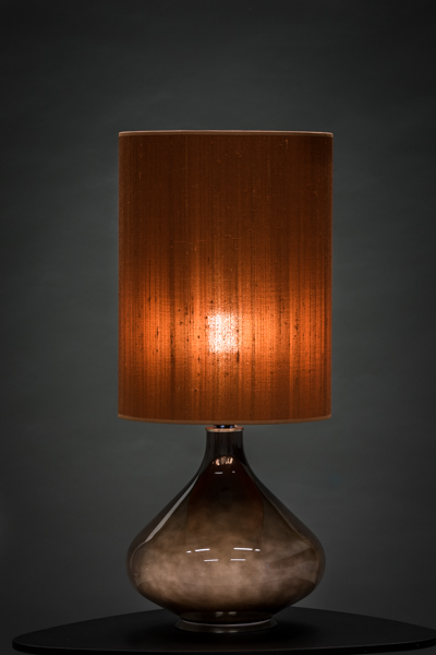 Håndlaget lampefot i glass fra spanske Thawaru med lys i foten. Alle er håndlaget og de kan derfor variere litt i fargen når lyset i foten er tent, fra lysere- til mørkebrun. Når lyset i foten ikke er på ser lampefoten sort ut. Lampefoten lyser når skjermen tennes, man kan velge å skru av skjermen slik at kun foten lyser.