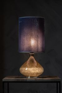 Håndlaget lampefot i glass fra spanske Thawaru med lys i foten. Alle er håndlaget og de kan derfor variere litt i fargen når lyset i foten er tent, fra lysere- til mørkebrun. Når lyset i foten ikke er på ser lampefoten sort ut. Lampefoten lyser når skjermen tennes, man kan velge å skru av skjermen slik at kun foten lyser.