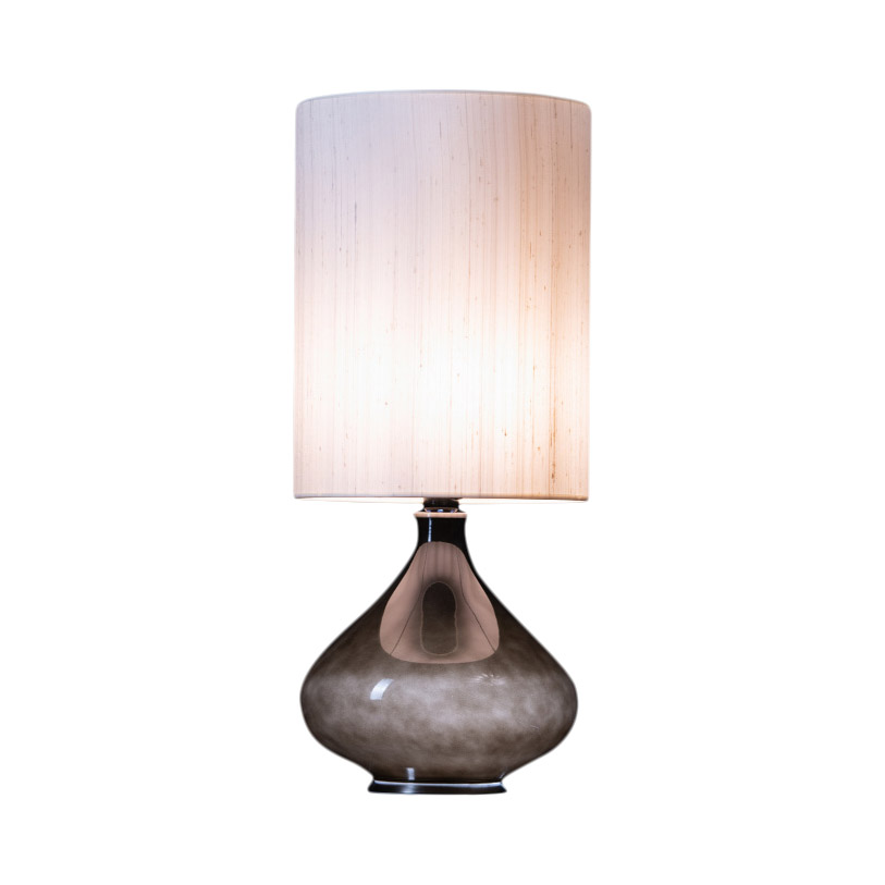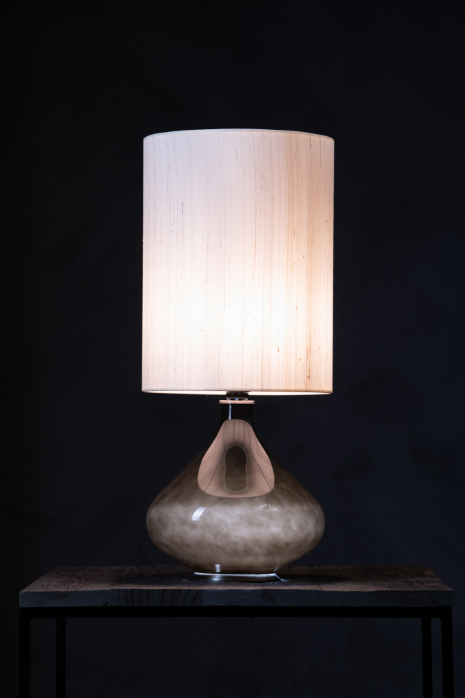 Håndlaget lampefot i glass fra spanske Thawaru med lys i foten. Alle er håndlaget og de kan derfor variere litt i fargen når lyset i foten er tent, fra lysere- til mørkebrun. Når lyset i foten ikke er på ser lampefoten sort ut. Lampefoten lyser når skjermen tennes, man kan velge å skru av skjermen slik at kun foten lyser.