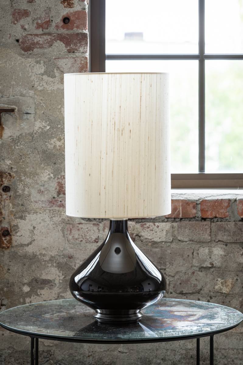 Håndlaget lampefot i glass fra spanske Thawaru med lys i foten. Alle er håndlaget og de kan derfor variere litt i fargen når lyset i foten er tent, fra lysere- til mørkebrun. Når lyset i foten ikke er på ser lampefoten sort ut. Lampefoten lyser når skjermen tennes, man kan velge å skru av skjermen slik at kun foten lyser.