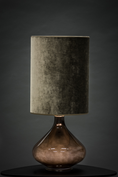 Håndlaget lampefot i glass fra spanske Thawaru med lys i foten. Alle er håndlaget og de kan derfor variere litt i fargen når lyset i foten er tent, fra lysere- til mørkebrun. Når lyset i foten ikke er på ser lampefoten sort ut. Lampefoten lyser når skjermen tennes, man kan velge å skru av skjermen slik at kun foten lyser.