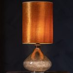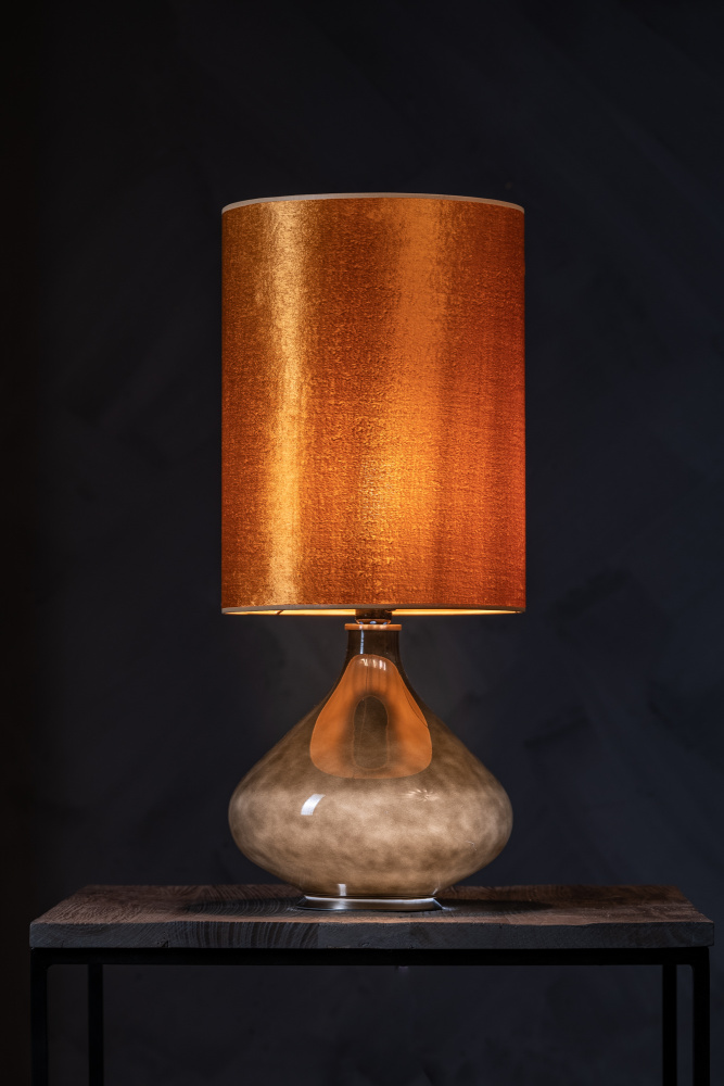 Håndlaget lampefot i glass fra spanske Thawaru med lys i foten. Alle er håndlaget og de kan derfor variere litt i fargen når lyset i foten er tent, fra lysere- til mørkebrun. Når lyset i foten ikke er på ser lampefoten sort ut. Lampefoten lyser når skjermen tennes, man kan velge å skru av skjermen slik at kun foten lyser.