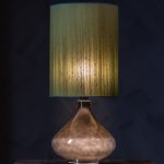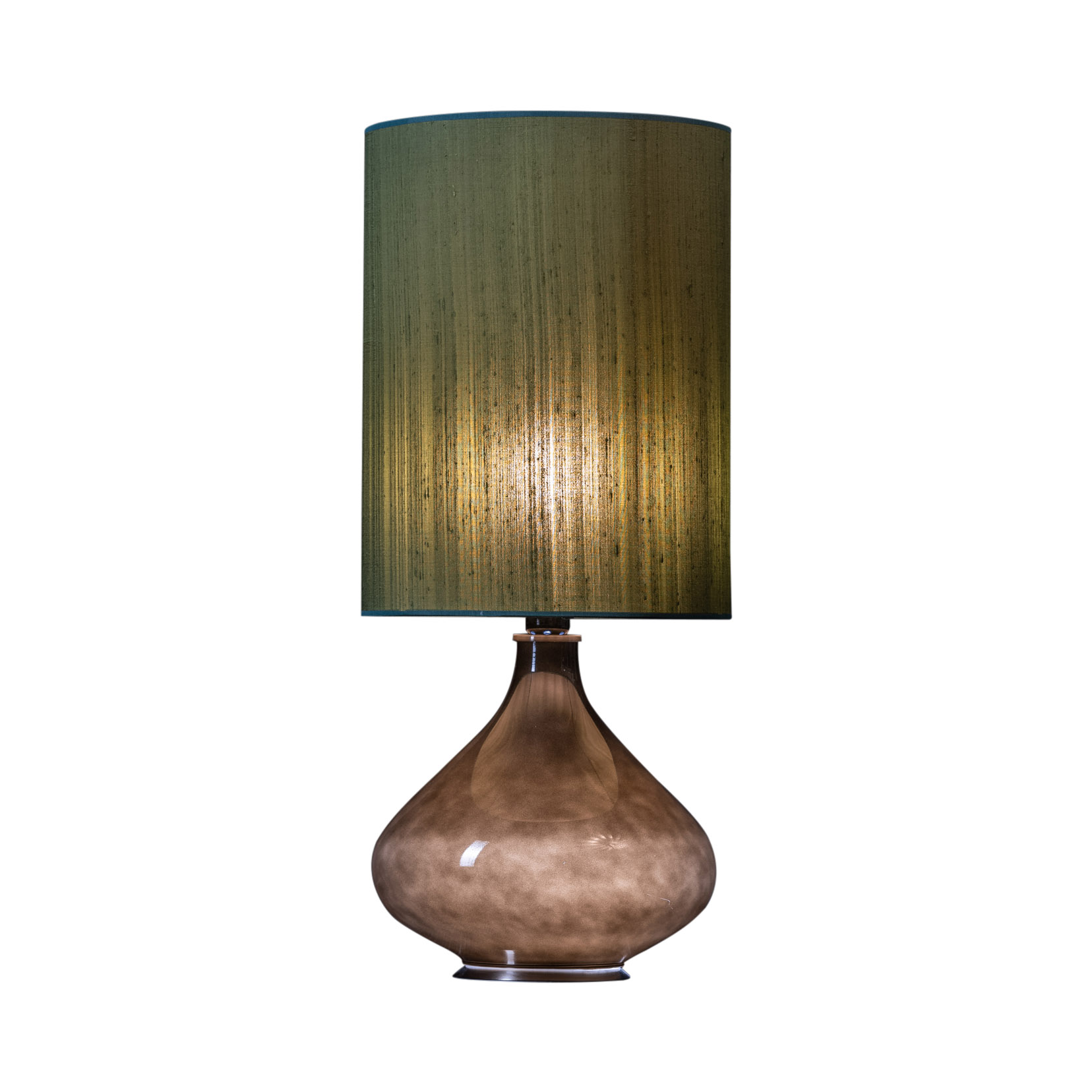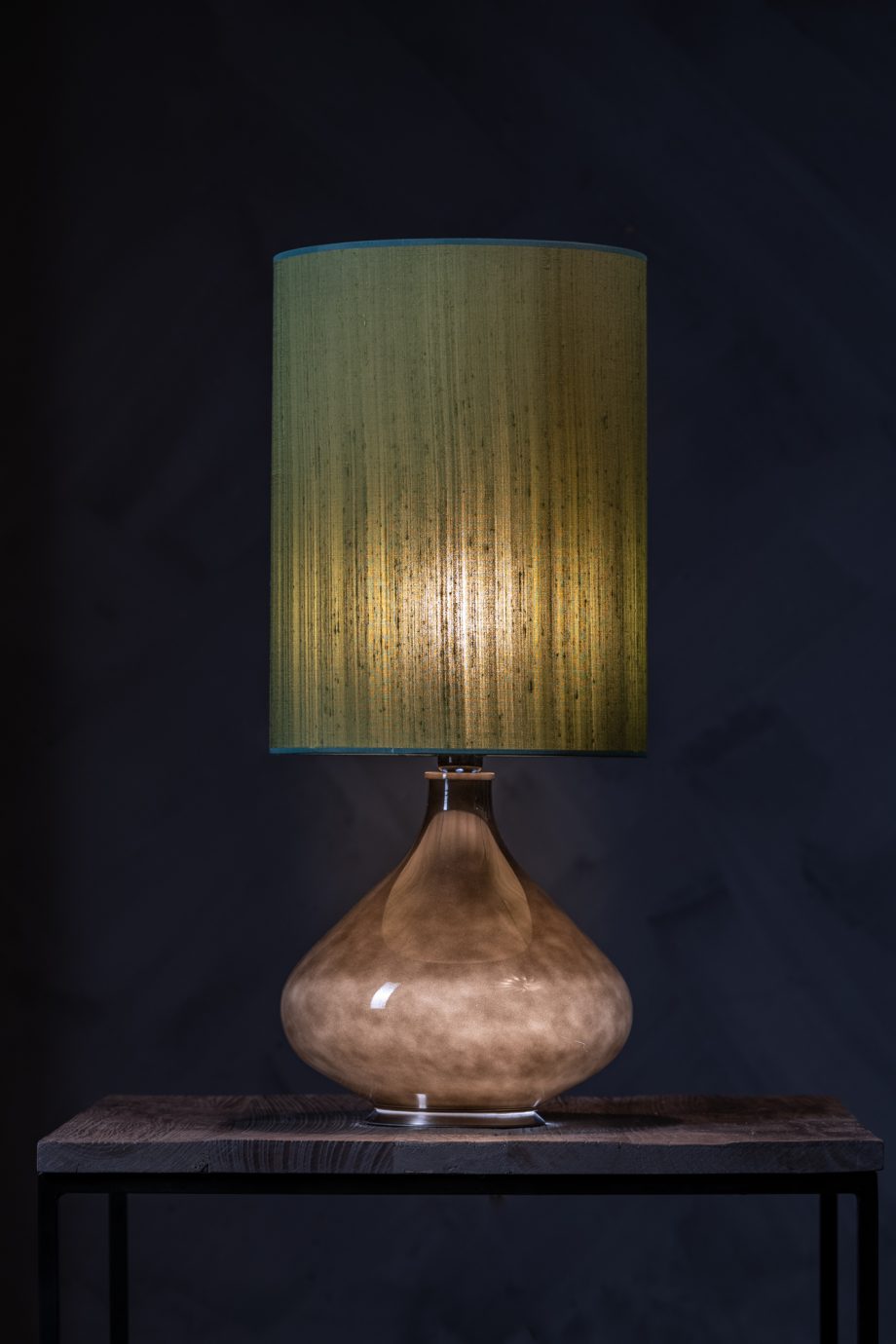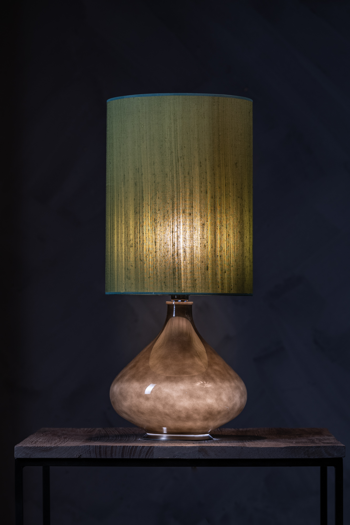 Håndlaget lampefot i glass fra spanske Thawaru med lys i foten. Alle er håndlaget og de kan derfor variere litt i fargen når lyset i foten er tent, fra lysere- til mørkebrun. Når lyset i foten ikke er på ser lampefoten sort ut. Lampefoten lyser når skjermen tennes, man kan velge å skru av skjermen slik at kun foten lyser.