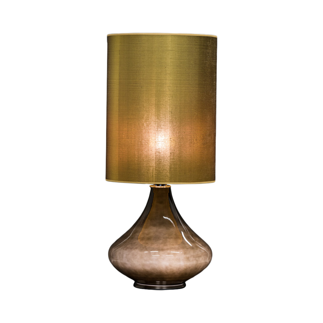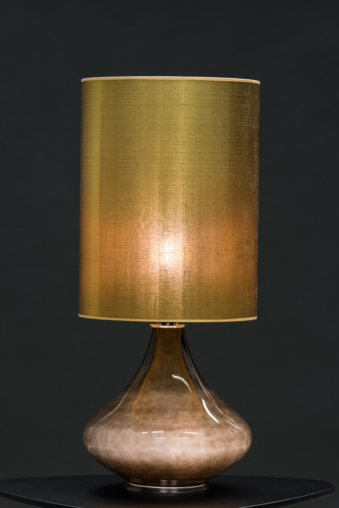 Håndlaget lampefot i glass fra spanske Thawaru med lys i foten. Alle er håndlaget og de kan derfor variere litt i fargen når lyset i foten er tent, fra lysere- til mørkebrun. Når lyset i foten ikke er på ser lampefoten sort ut. Lampefoten lyser når skjermen tennes, man kan velge å skru av skjermen slik at kun foten lyser.