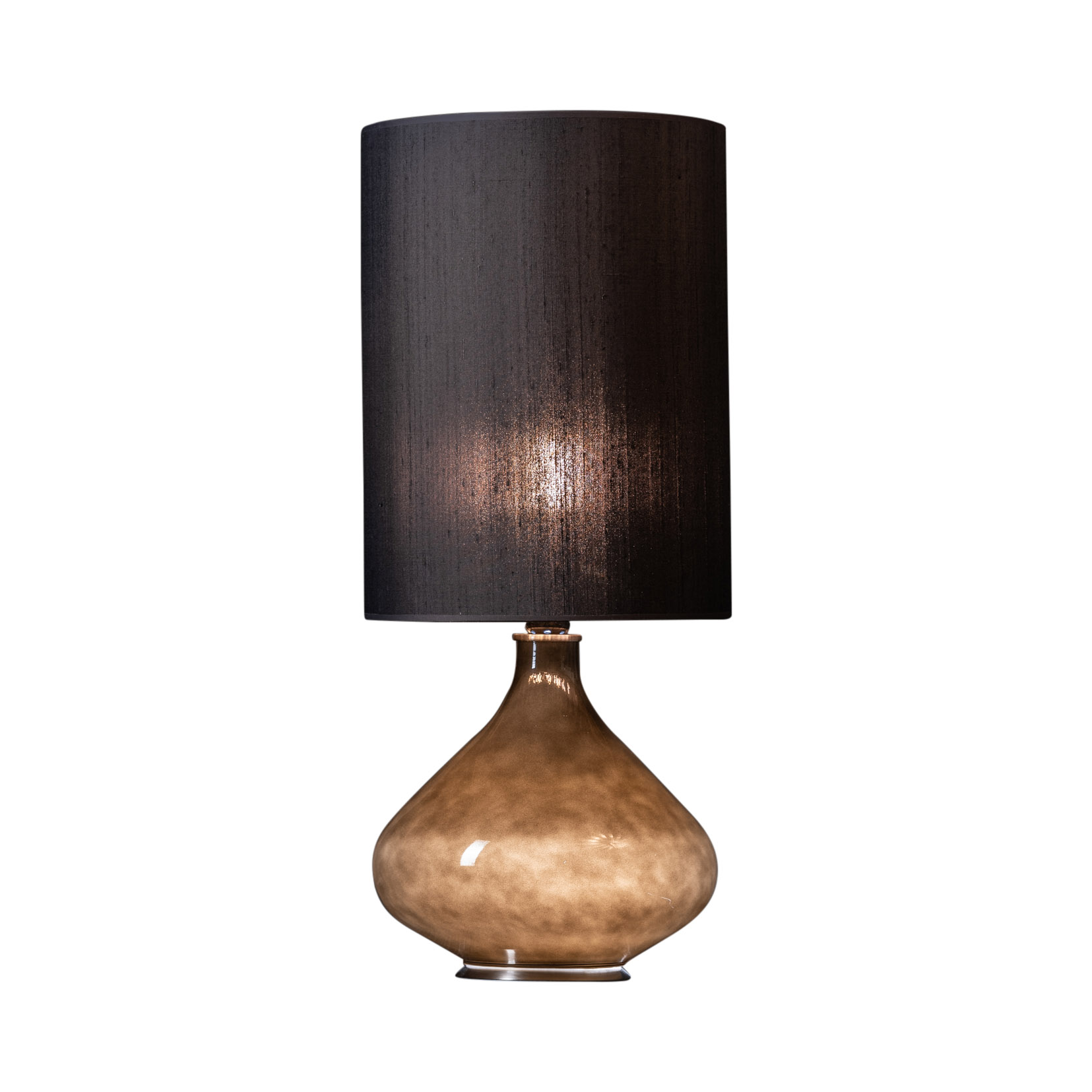 Håndlaget lampefot i glass fra spanske Thawaru med lys i foten. Alle er håndlaget og de kan derfor variere litt i fargen når lyset i foten er tent, fra lysere- til mørkebrun. Når lyset i foten ikke er på ser lampefoten sort ut. Lampefoten lyser når skjermen tennes, man kan velge å skru av skjermen slik at kun foten lyser.