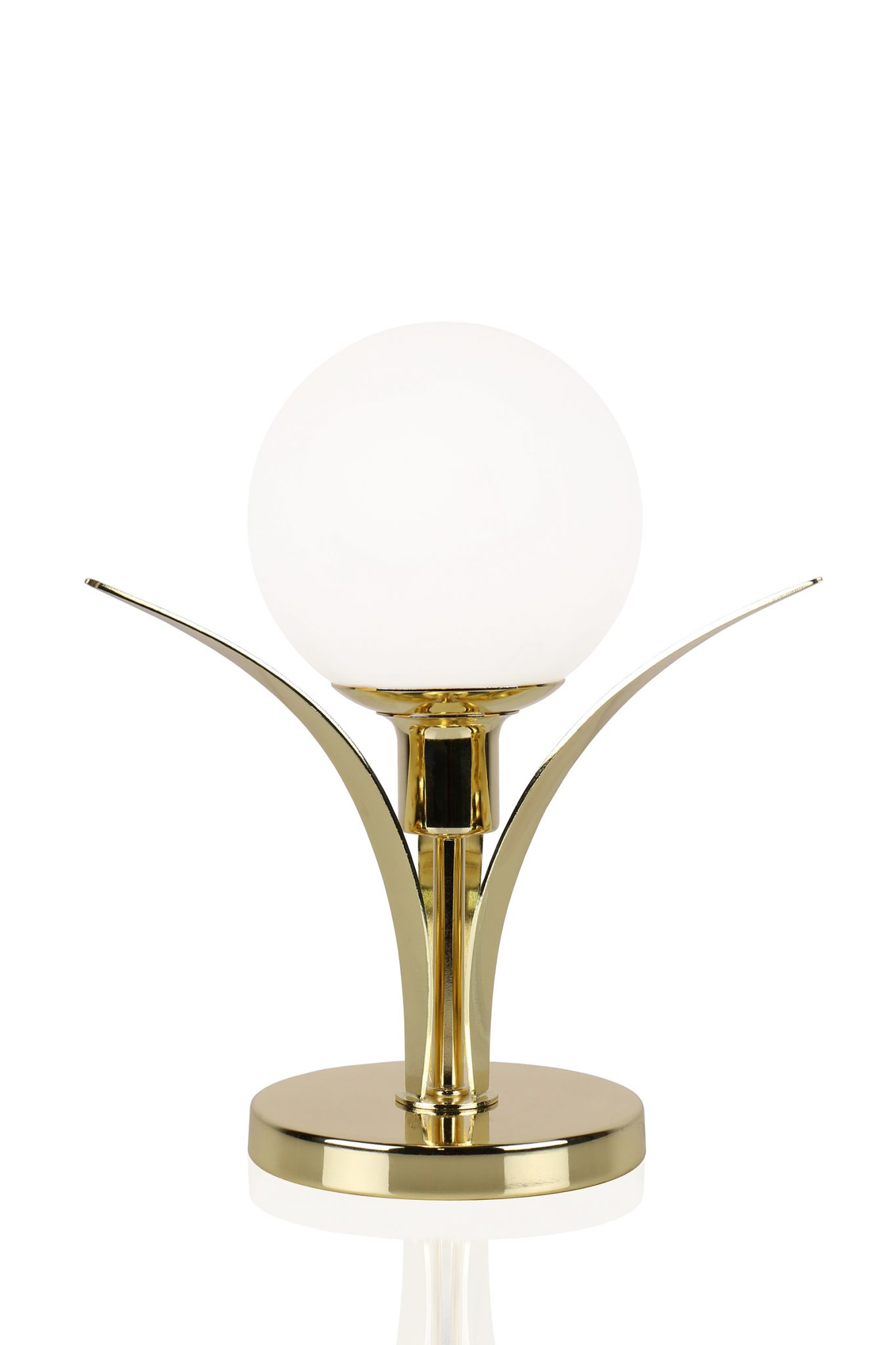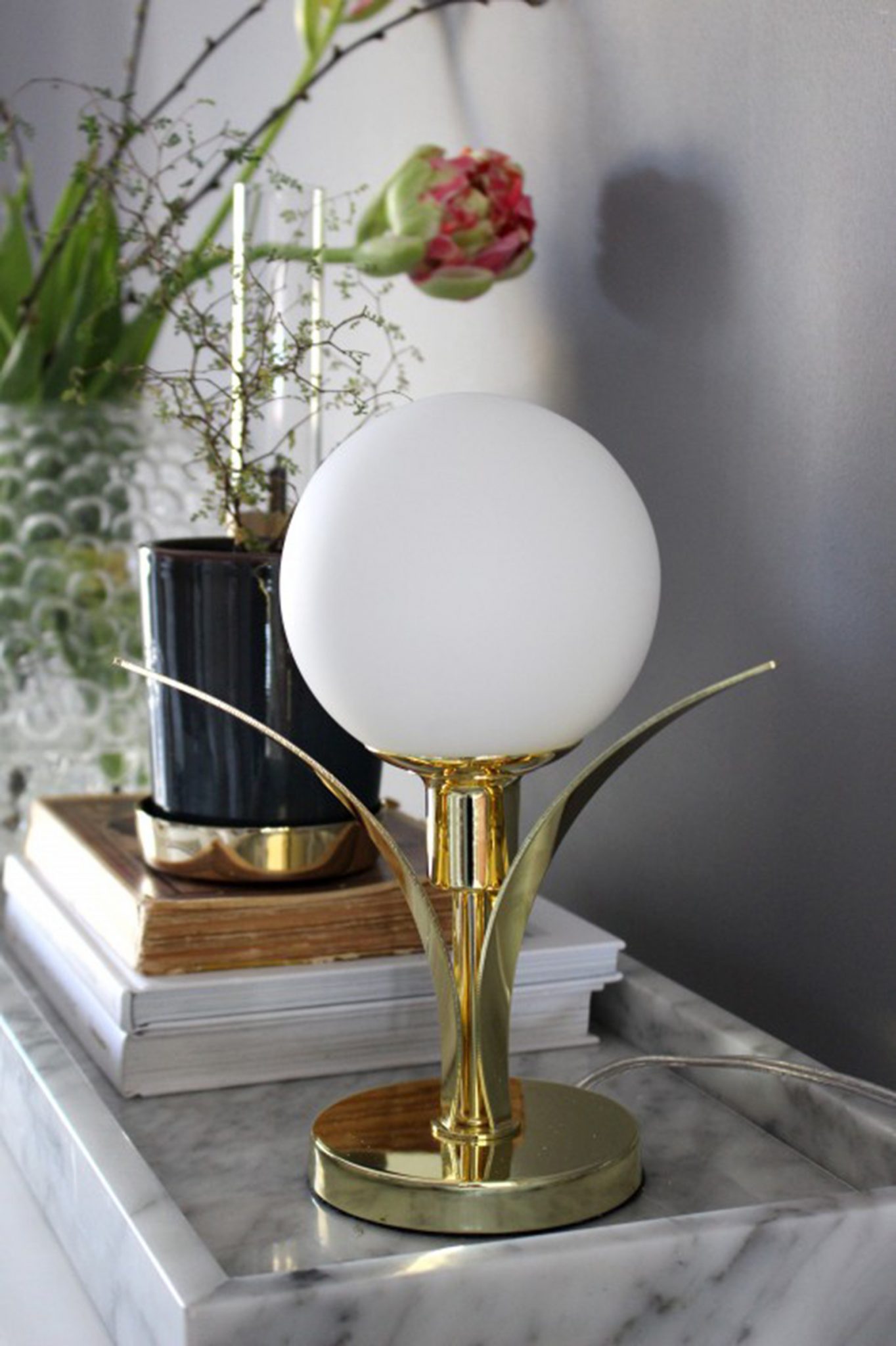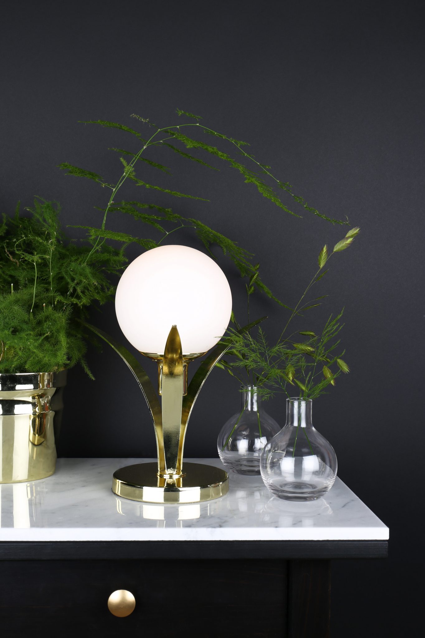 Bordlampen Savoy, en eksklusiv lampe i messing og hvit glasskuppel.