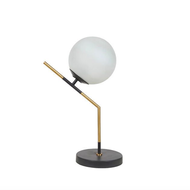 Bordlampe med sortlakkert metallfot. Messingdetaljer, og opal glasskuppel.