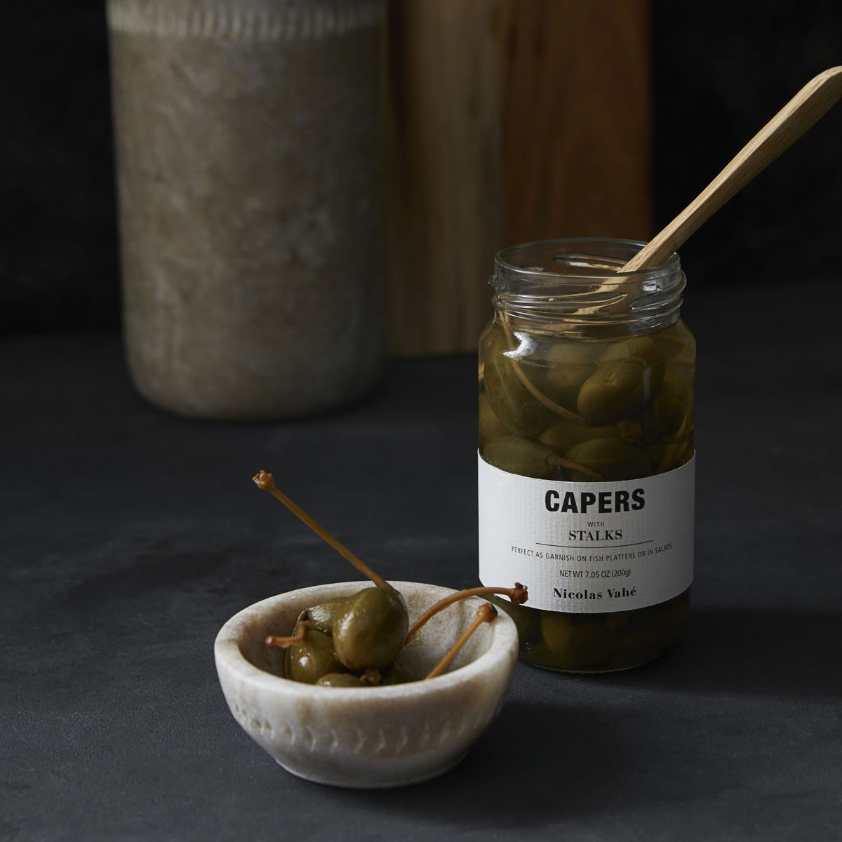 Ingenting slår kapers når det gjelder karakteristisk smak. Skarpe, salte og pikante, de er populære til krydder og pynt, spesielt i middelhavsmat. Disse kapersene er syltet sammen med stilkene og er den perfekte følgesvenn til retter med fisk og i tomatsauser, noe som gir smaken dybde. Du kan til og med spise dem som et alternativ til oliven. Nicolas Vahé har funnet frem disse kapersene til hjemmekokken som setter pris på de finere tingene i livet og matlagingen. Med disse kapersene tilføyer du de små detaljene som gjør hele forskjellen i matlagingen.