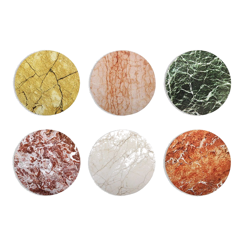 Lag et stilig bord i stuen din med disse marmorunderlagene. Laget av kork med marmortrykk. Hver dalbane har et annet design. Rengjør underlagene med en fuktig klut.