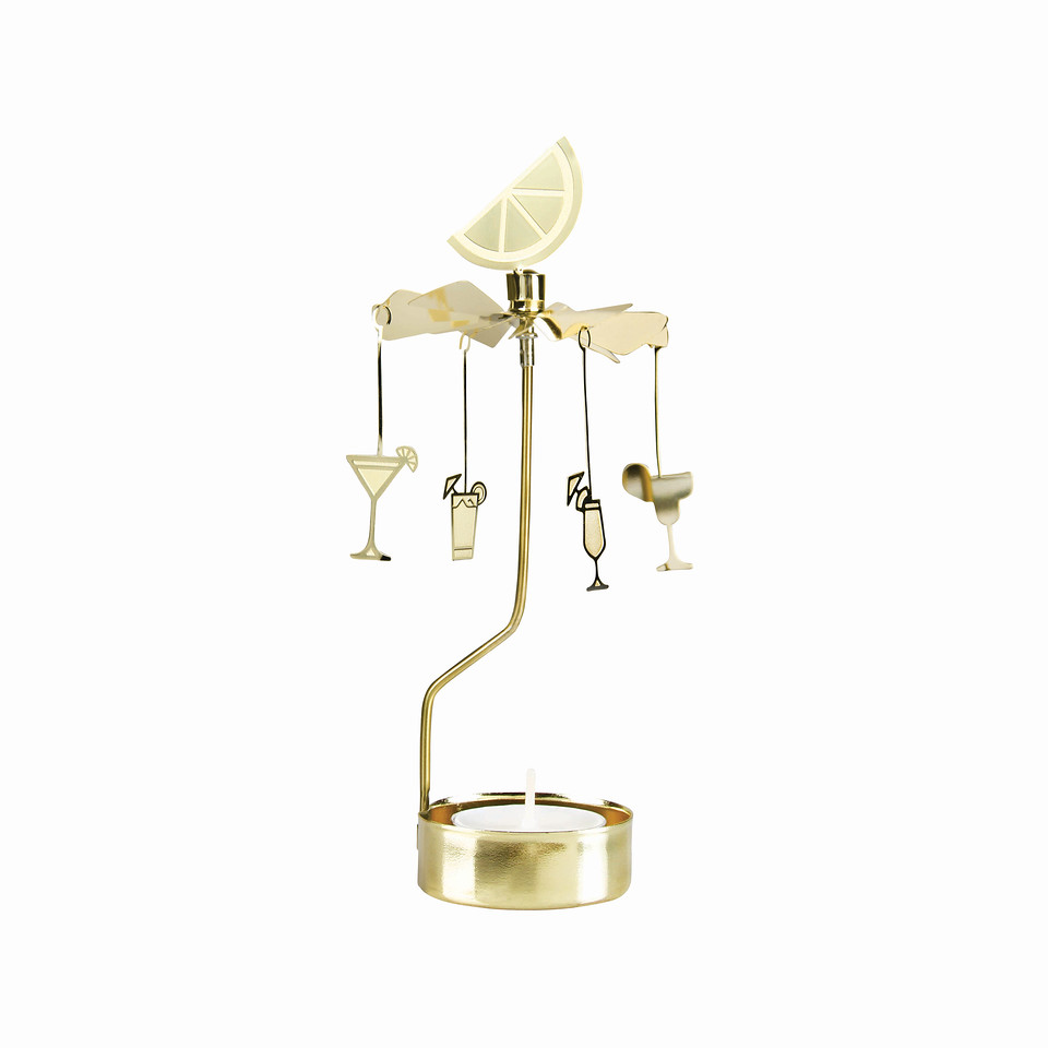 Cocktail go round, dekorativ telysholder i forgyllet metall. Varmen fra telysene gjør at cocktail glassene roterer rundt i ring.