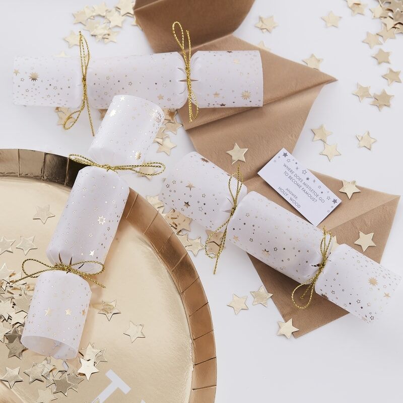 Trekk en cracker for å frigjøre den gullfolierte konfettien en krone og vits for å dele med gjestene dine.