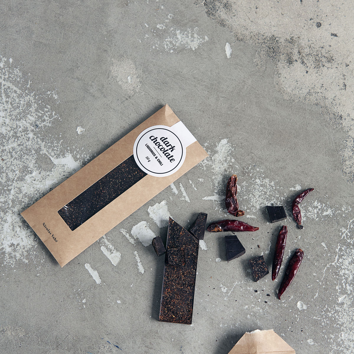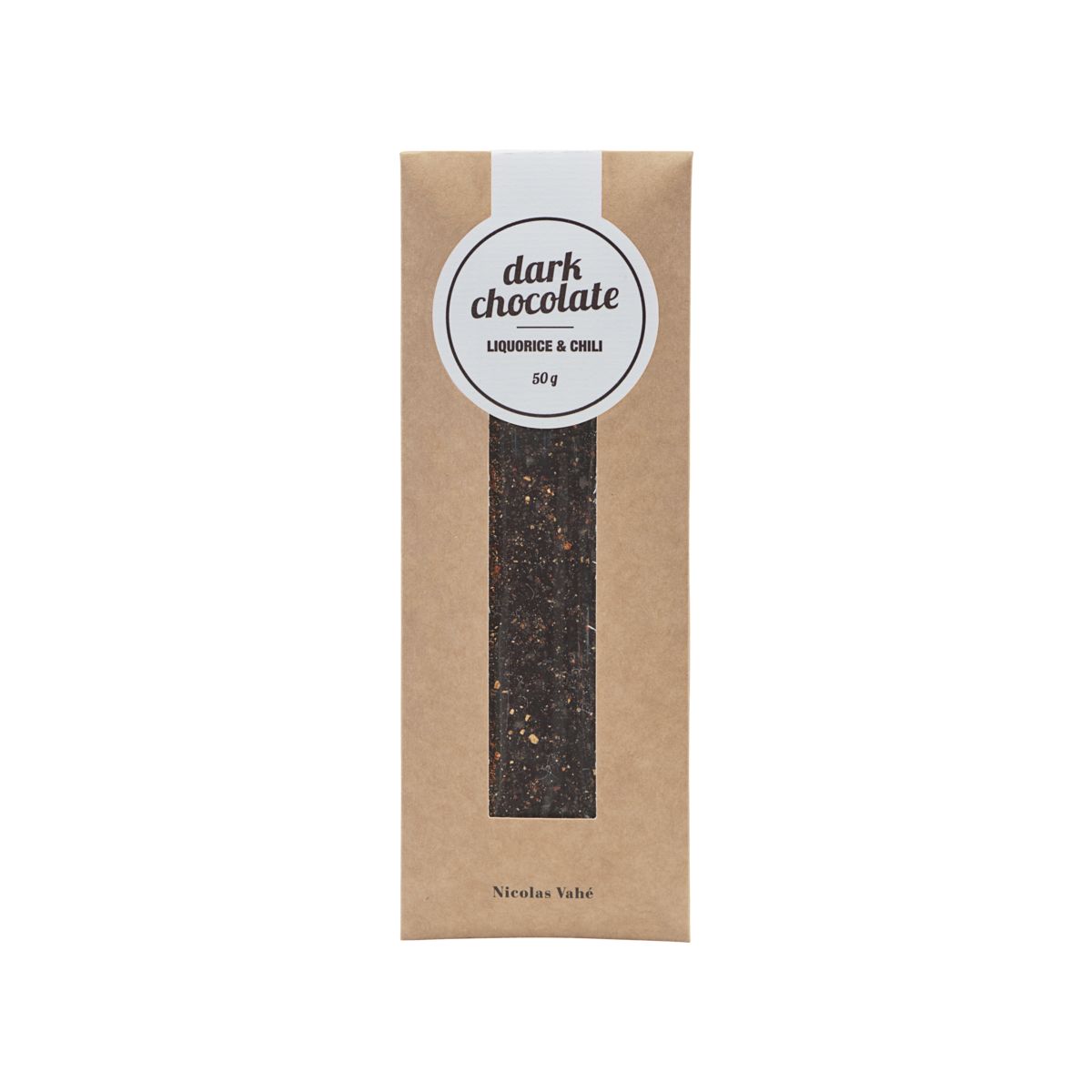 Denne lekre mørke sjokolade med et kakaoinnhold på minimum 73% suppleres med den fantastiske smaken av lakris og chili som kombineres i denne herlige sjokoladebaren. Ta den med deg på farten hvis du er på jakt etter noe søtt, eller del den med noen du bryr deg om. Du kan også bruke den i desserter for en ny og spennende vri.