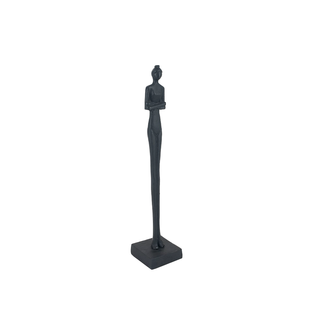 Dekorativ skulptur av en kvinne med foldede armer i sort metall. Håndlaget med delikate detaljer. Dette produktet er perfekt som et midtpunkt i hjemmet ditt.