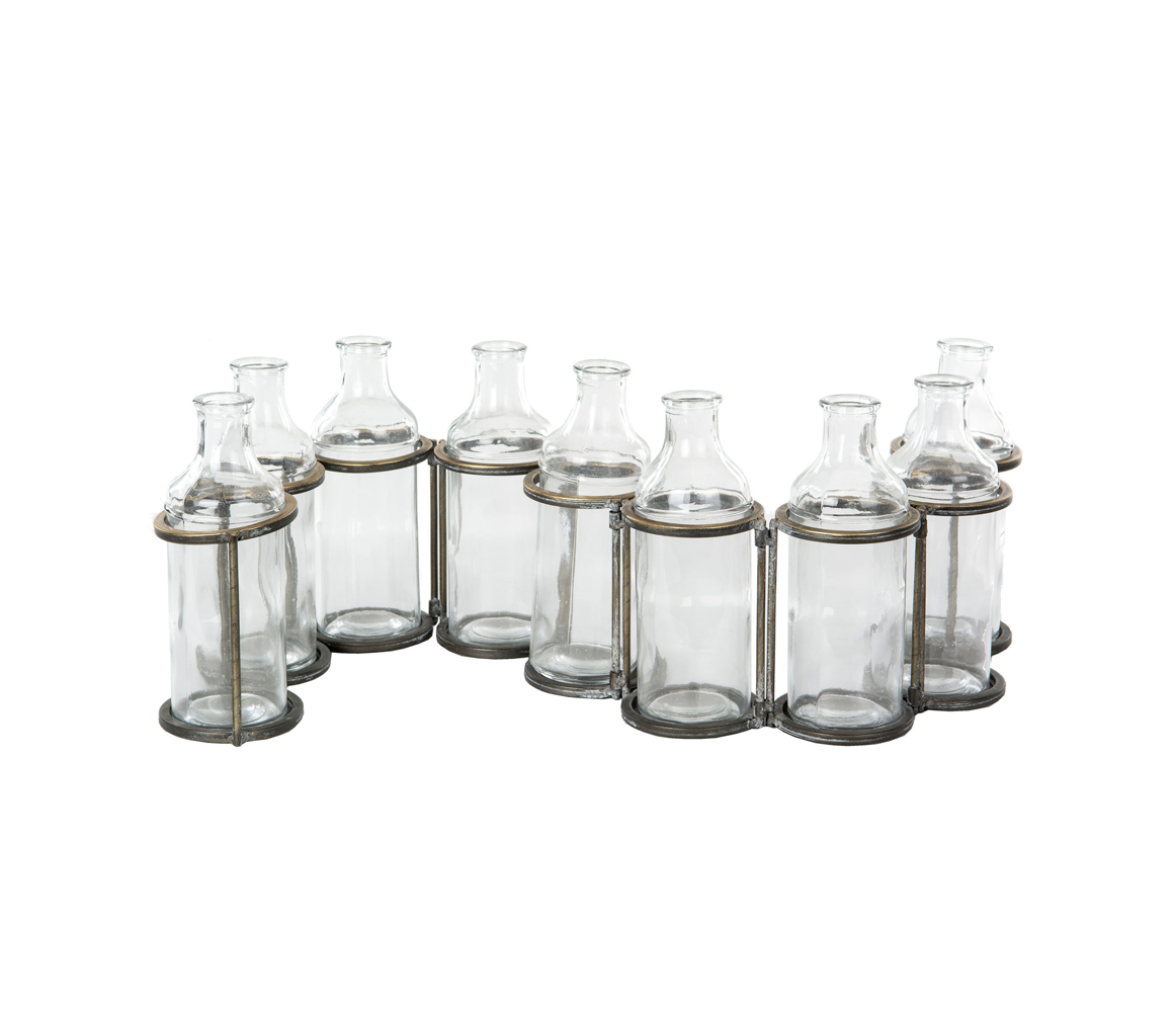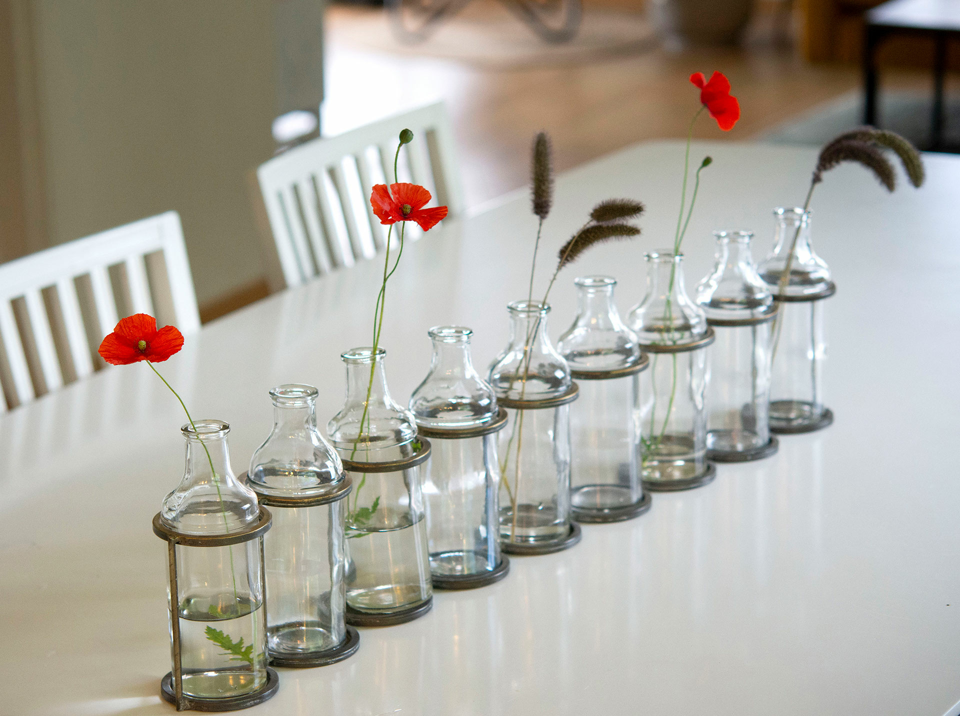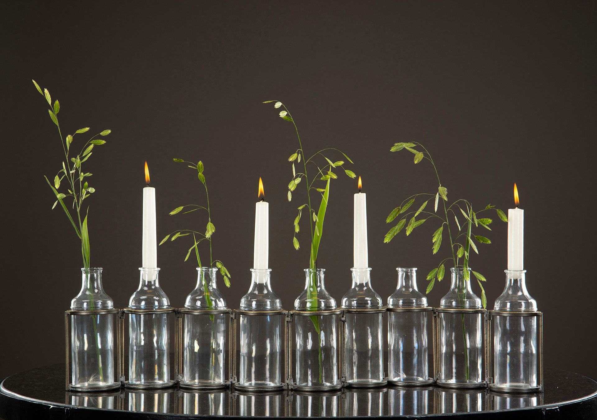 Dekorasjon med flasker i stativ. Fyll den med både blomster og levende lys for å skape en herlig stemning.