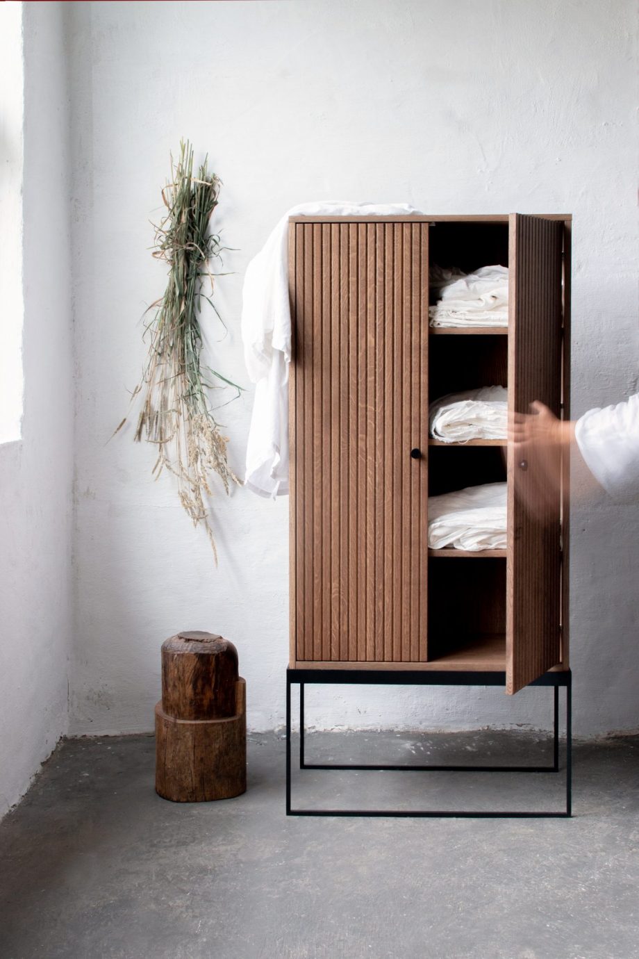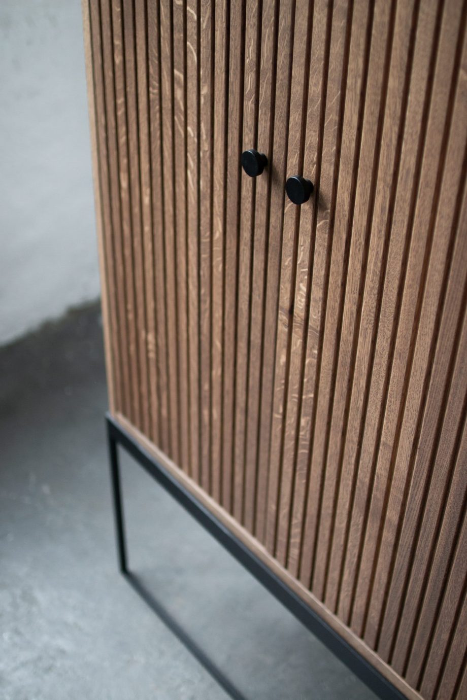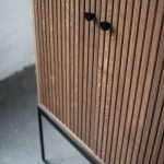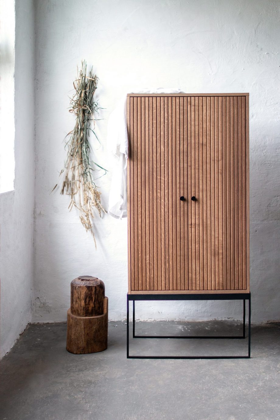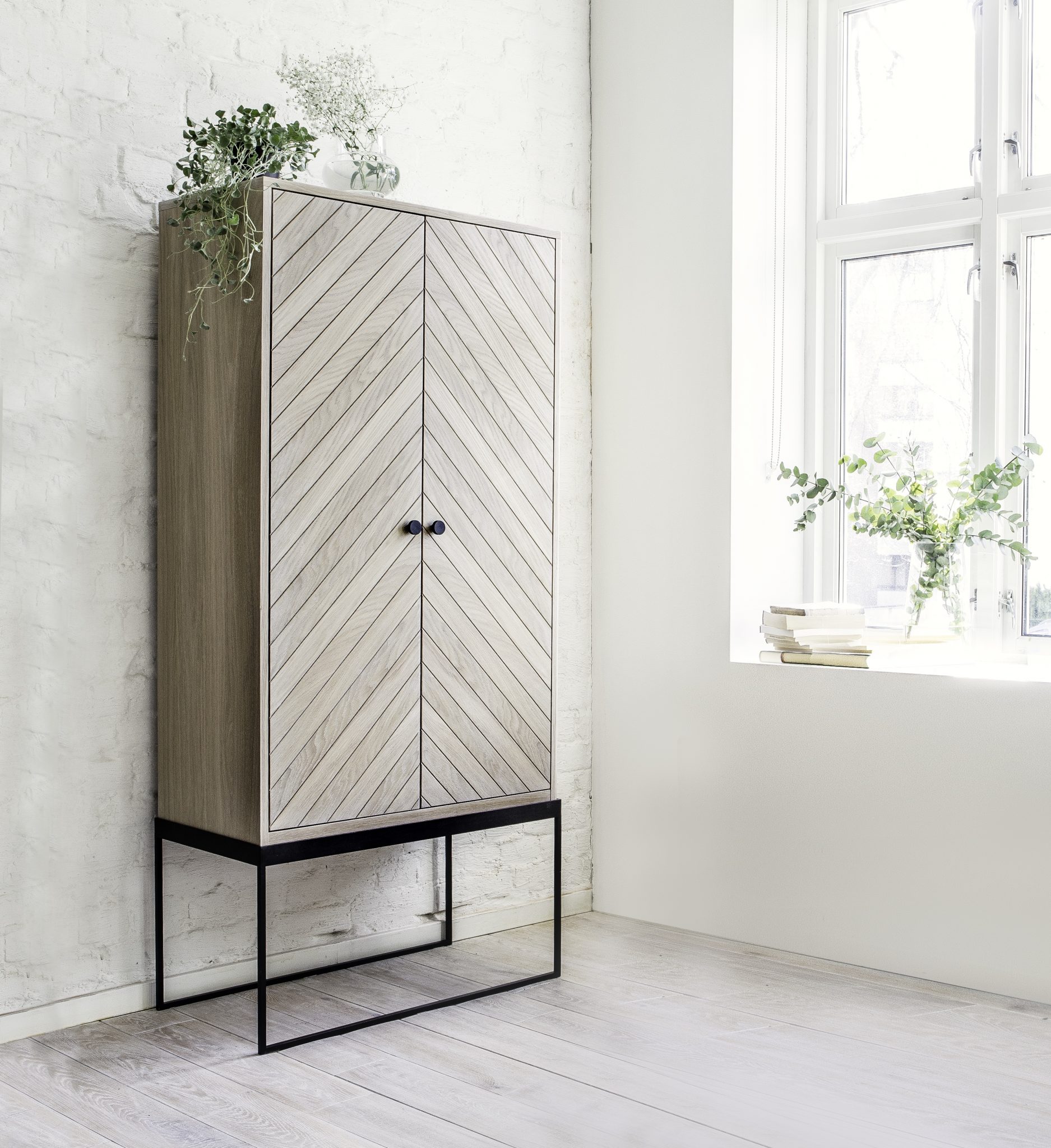 Med Dis skap 168 er kombinasjonen av overdimensjonert og minimalistisk en sterk motsetning. Massivt håndverk og ærlige eikematerialer suppleres med en pulverlakkert stålramme. Velg mellom sortbeiset, hvitoljet eller smoked og håndtak i messing eller sortlakkert metall.