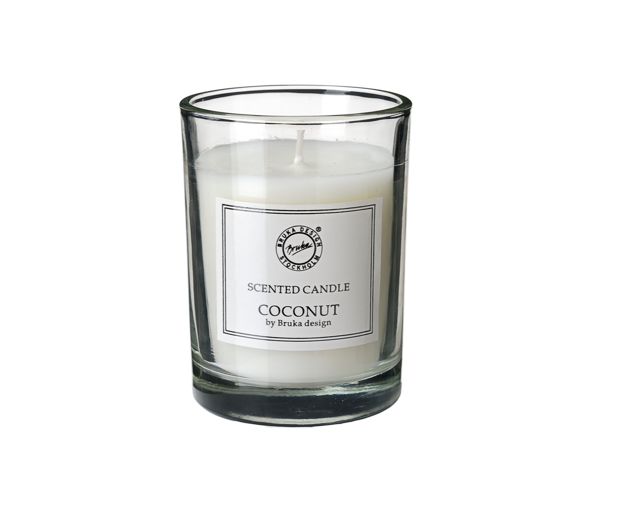 Duftlys, Coconut i glass. Brenntid er 33 timer, laget av parafin.