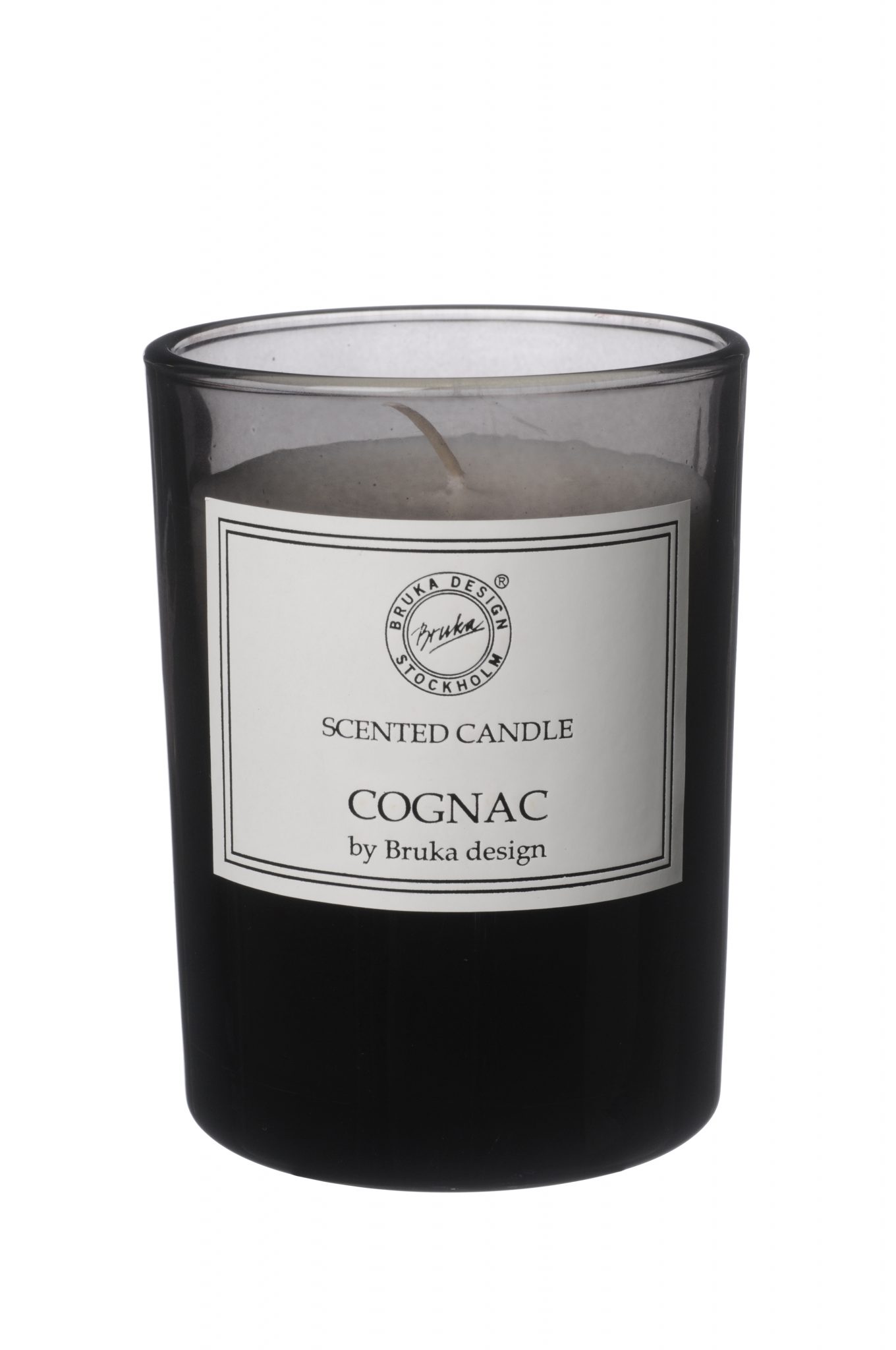 Duftlys, cognac i smoked glass. Brenntid er 33 timer, laget av parafin.