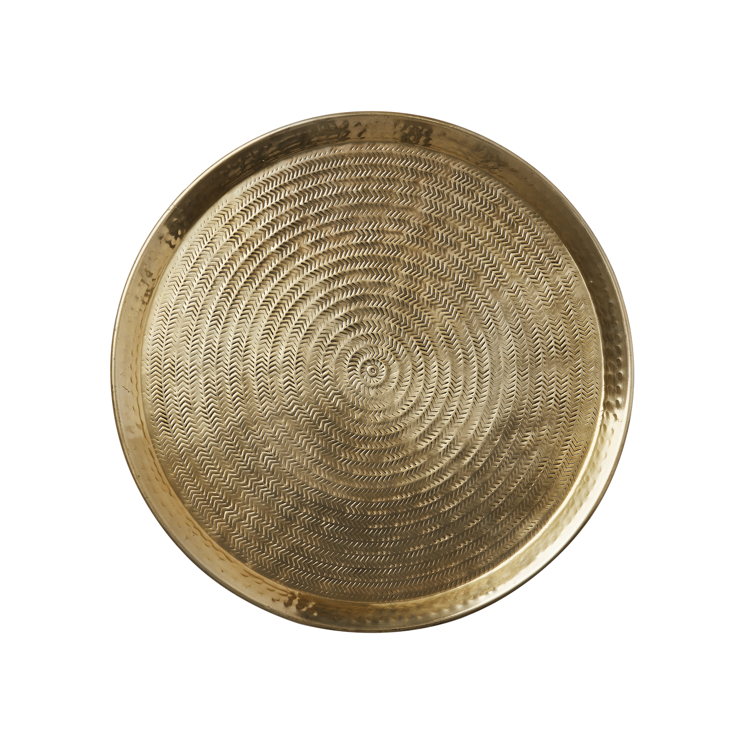 Fat i hamret metall som er forgyllet. Fatet har mønster, noe som gir den et bevisst ufullkomment uttrykk, noe som sikrer sjarm og stil. Sett det i fokus på en skjenk eller på salongbordet sammen med lysestaker og annen dekor. Et stilleben som utvilsomt tiltrekker seg oppmerksomhet.