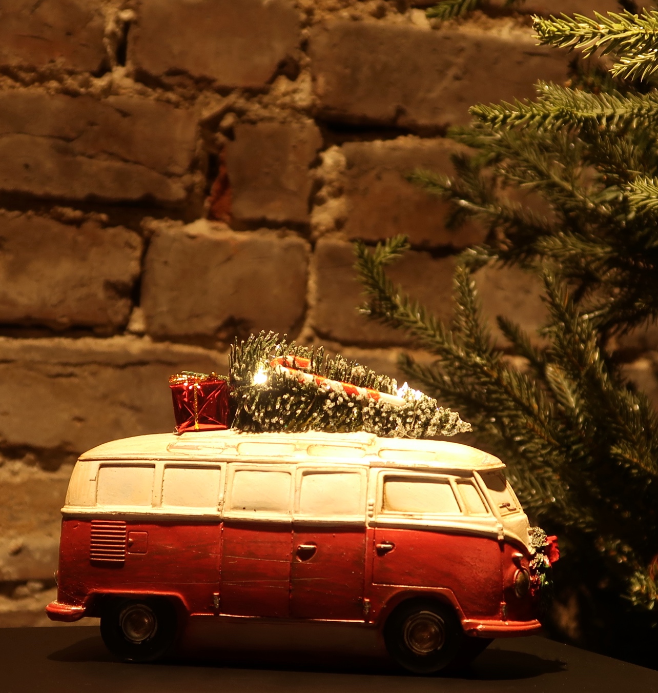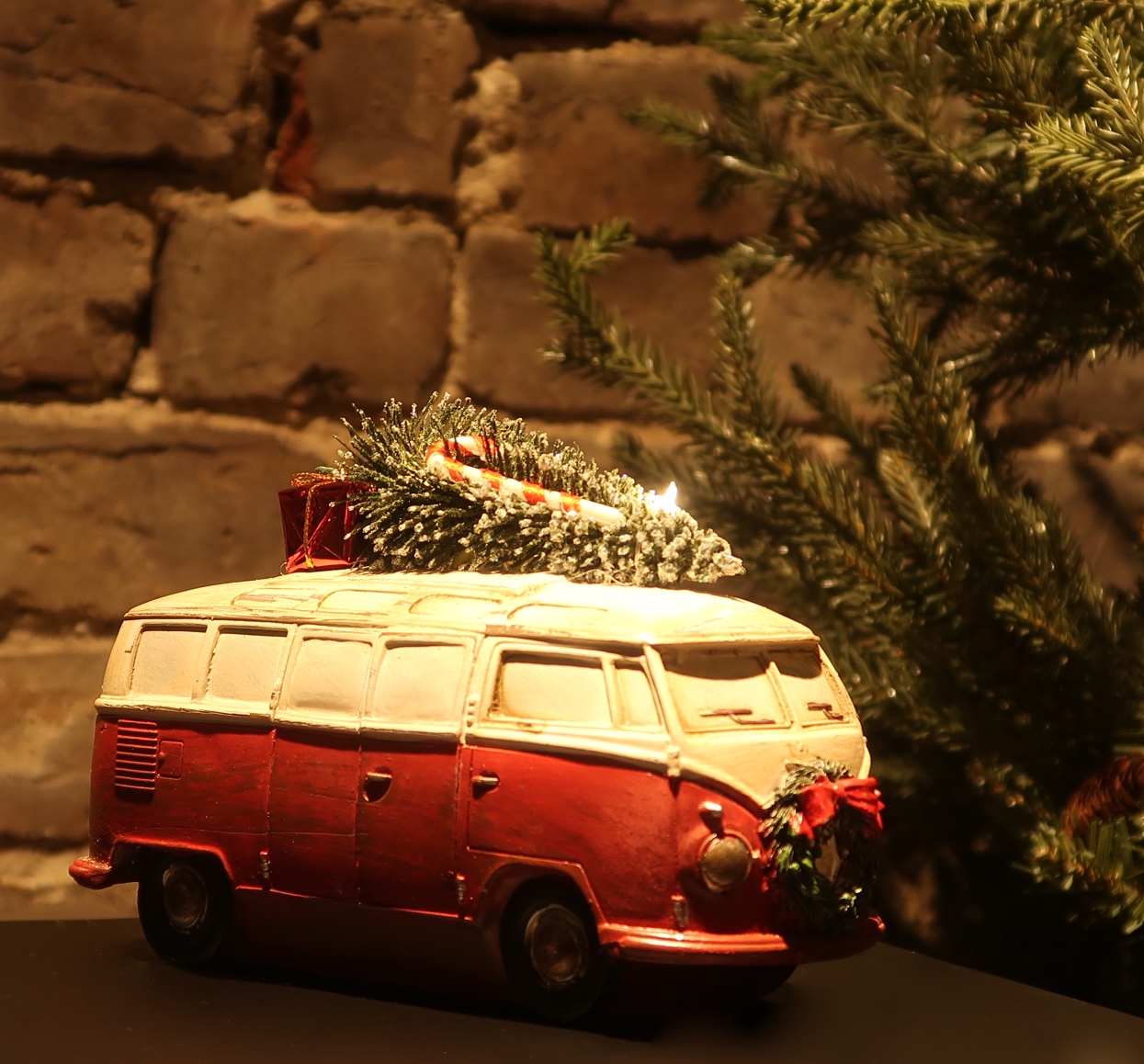 Dekorativ folkevognbuss med tre og gaver på taket med lys.