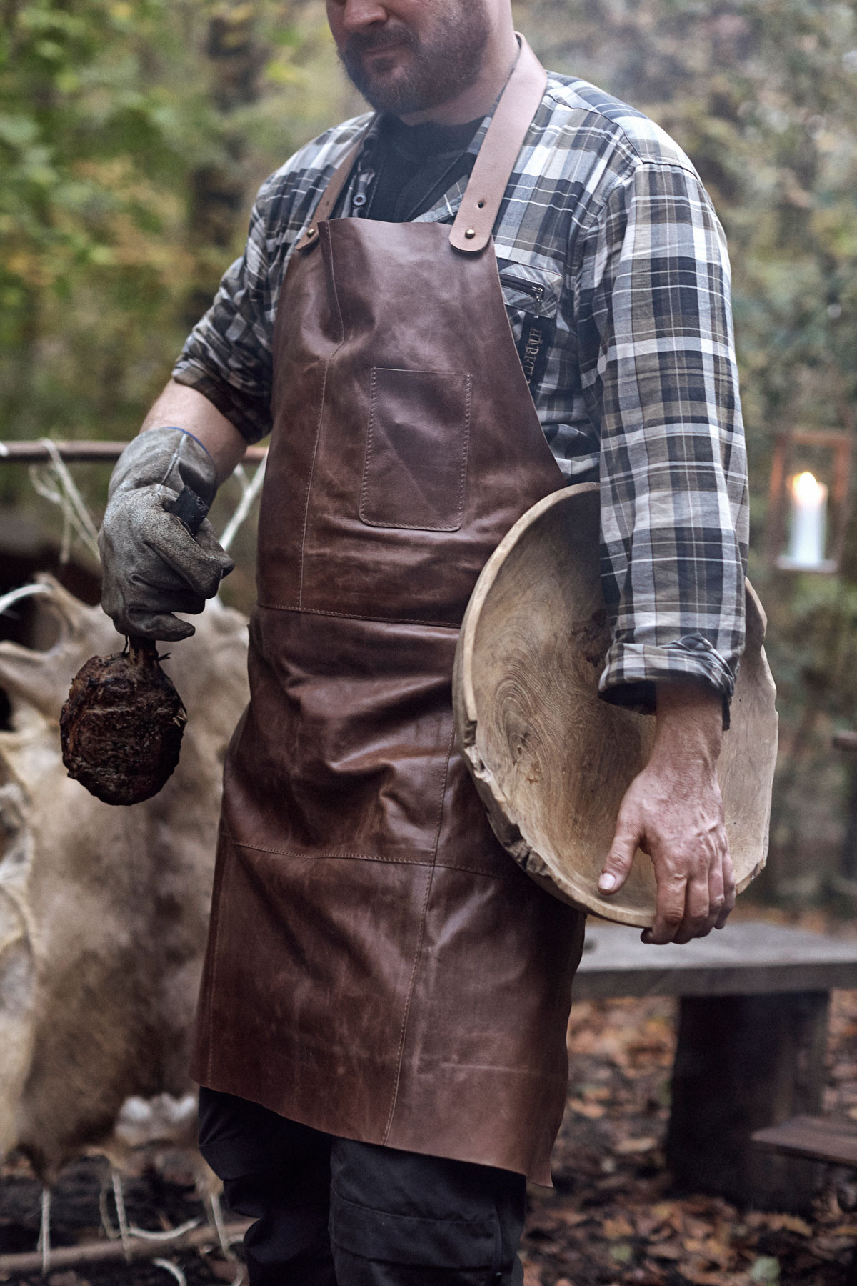 Et tidløst og elegant forkle, i mykt og kraftig bøffelskinn. Forkle blir bare vakrere ved bruk. En flott gave til den som «har alt.»