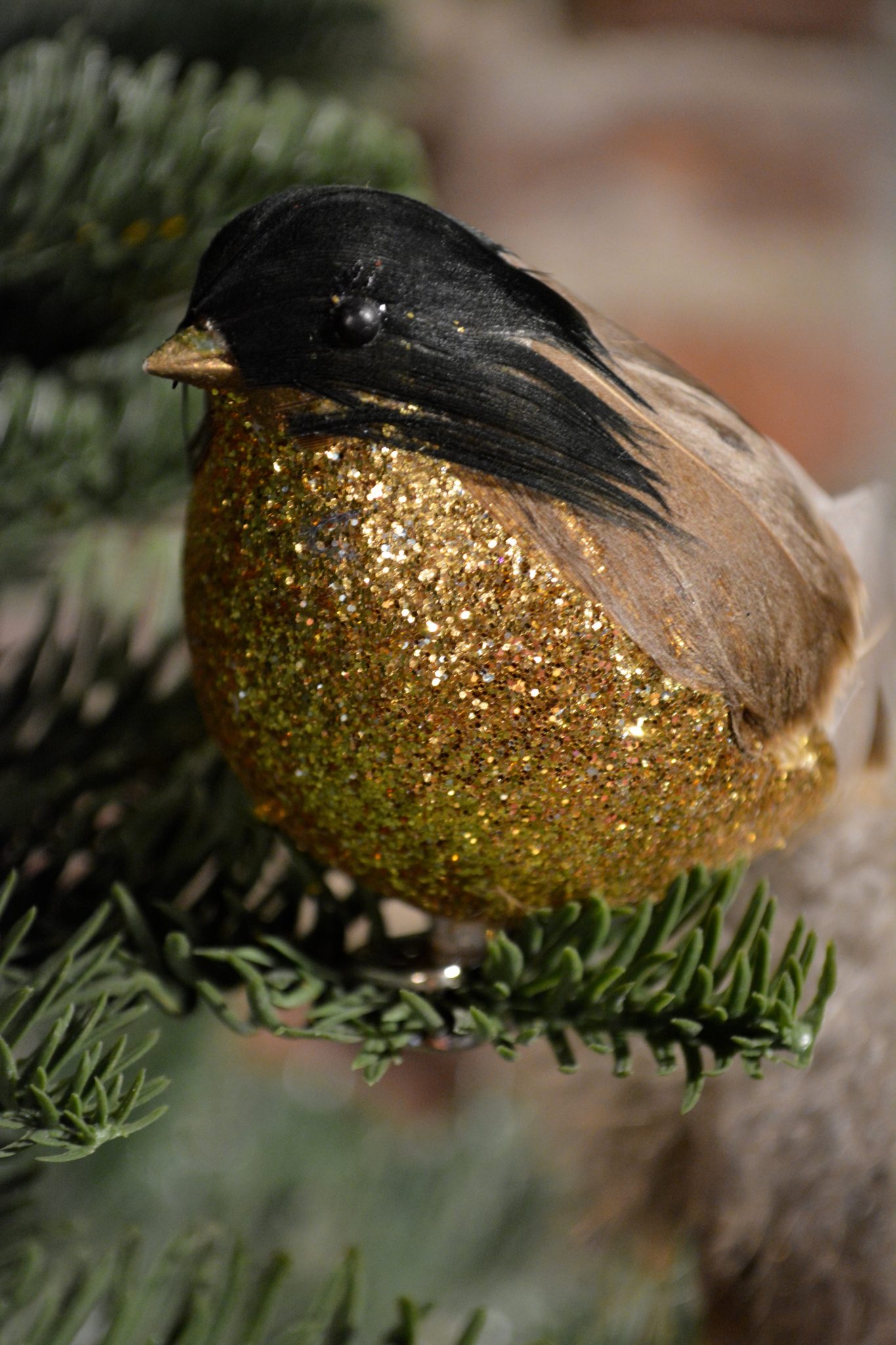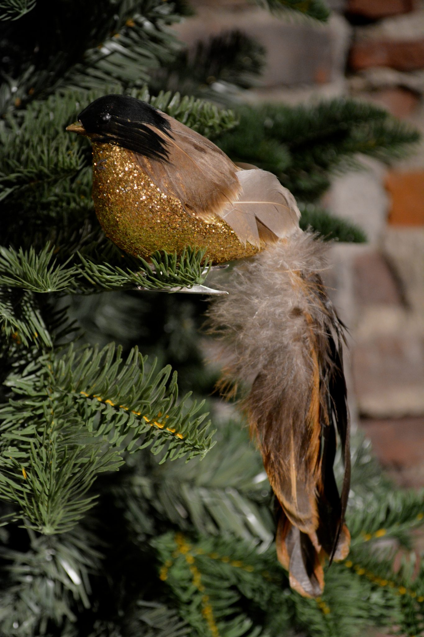 Dekorativ fugl med velur og brune fjær, klype til å feste den på en gren eller på juletreet.