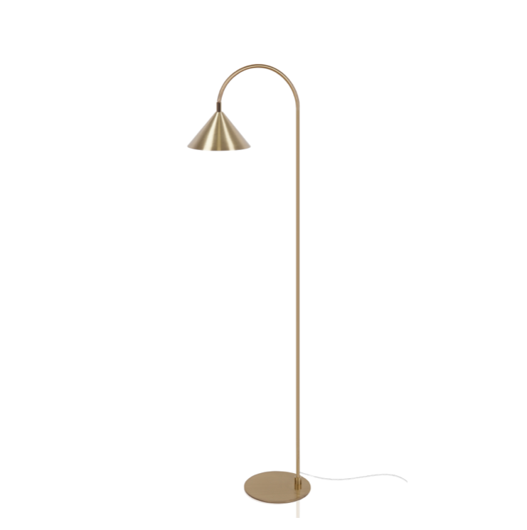 Gulvlampen Brisol med børstet messingskjerm med hvit innside. Perfekt leselampe!