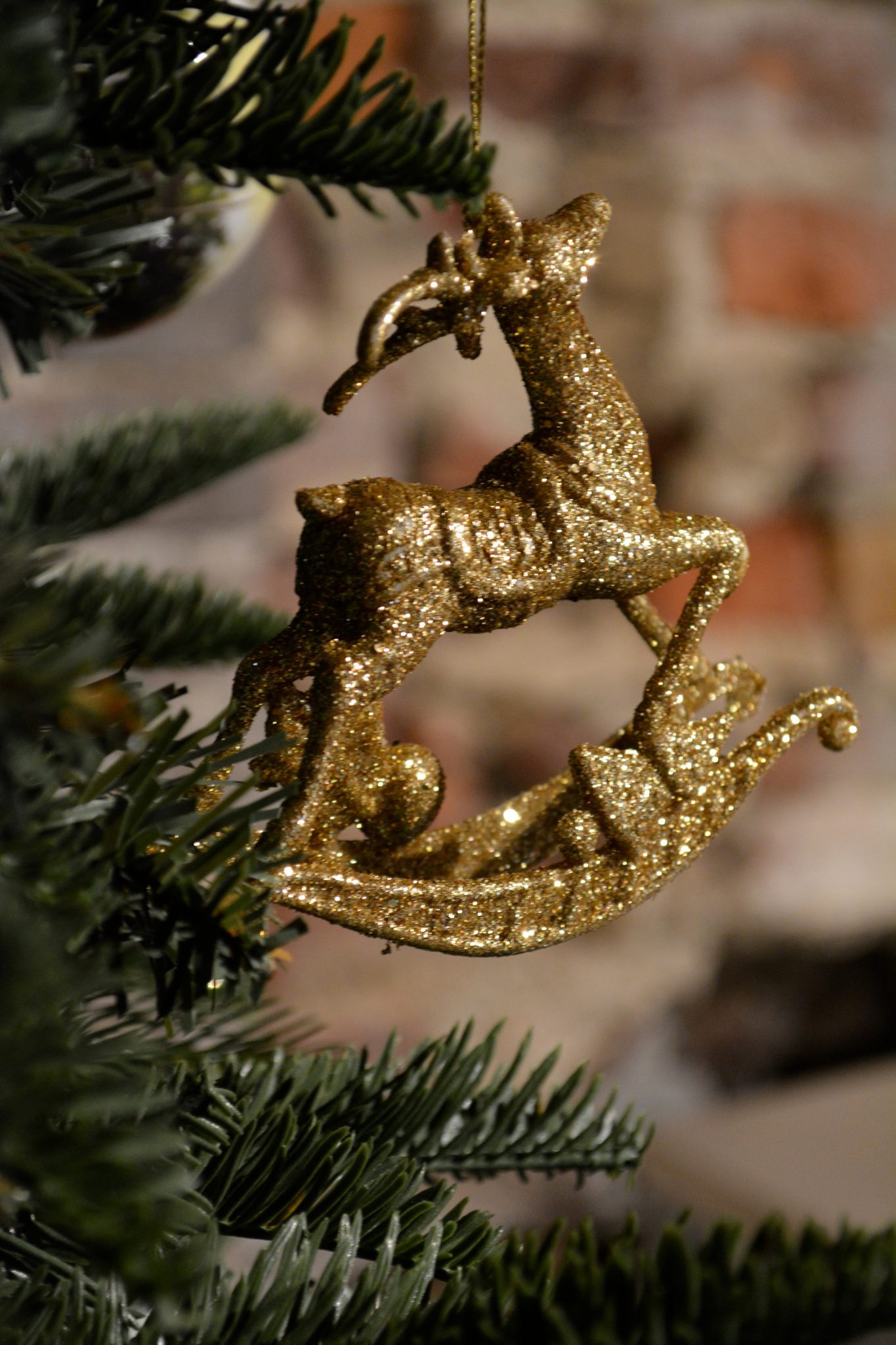 Dekorativ gyngehest med gull og glitter. Kan henge på juletreet eller stå på et fat.