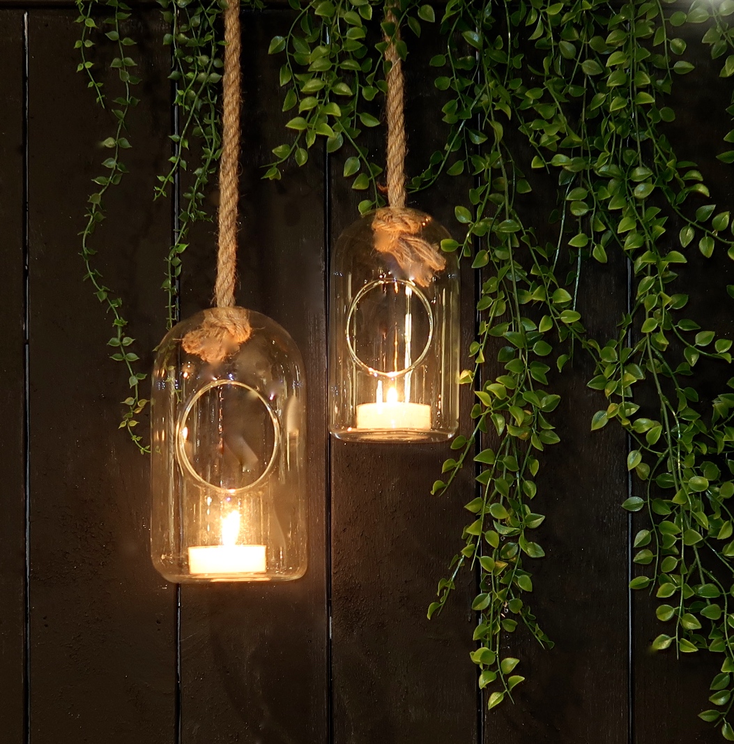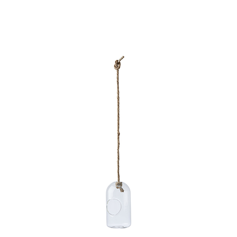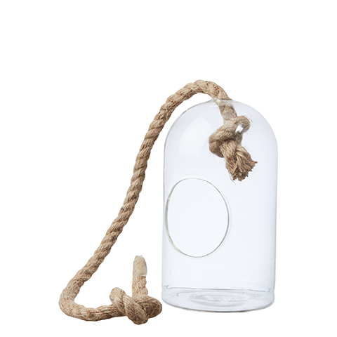 Dekorativ hengepotte i glass, følger med en tykt hampetau til oppheng. Potten har flatt bund så like dekorativ på et bord eller fat som hengende i et vindu.
