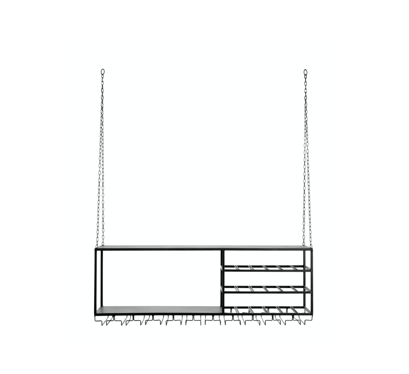 Industrielt og stilrent hylle i sort metall for takmontering, perfekt på kjøkkenet. Egent oppheng for glass og vinflasker. Maks vekt er 80 kg.