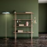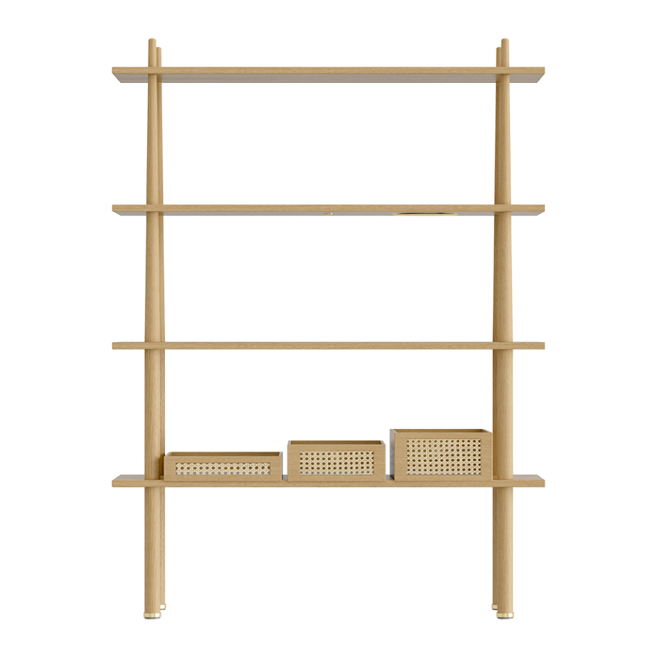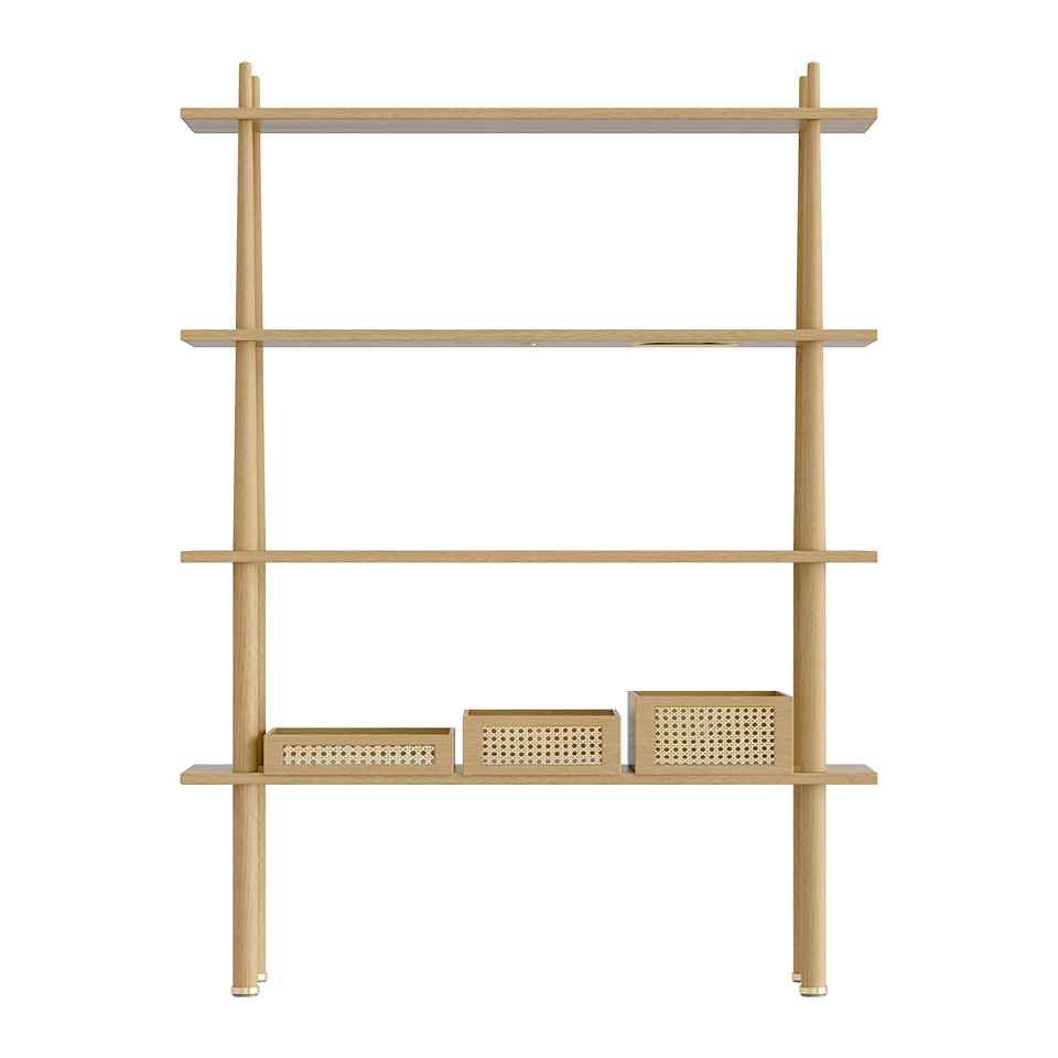 Stories er laget av eik, der du kan velge mellom lys eller mørk eik og har en enkel visuell tiltrekning med sine fire koniske ben som skaper et smidig og fint utseende. Hyllesystemet kommer med fire messingføtter som kan justeres.