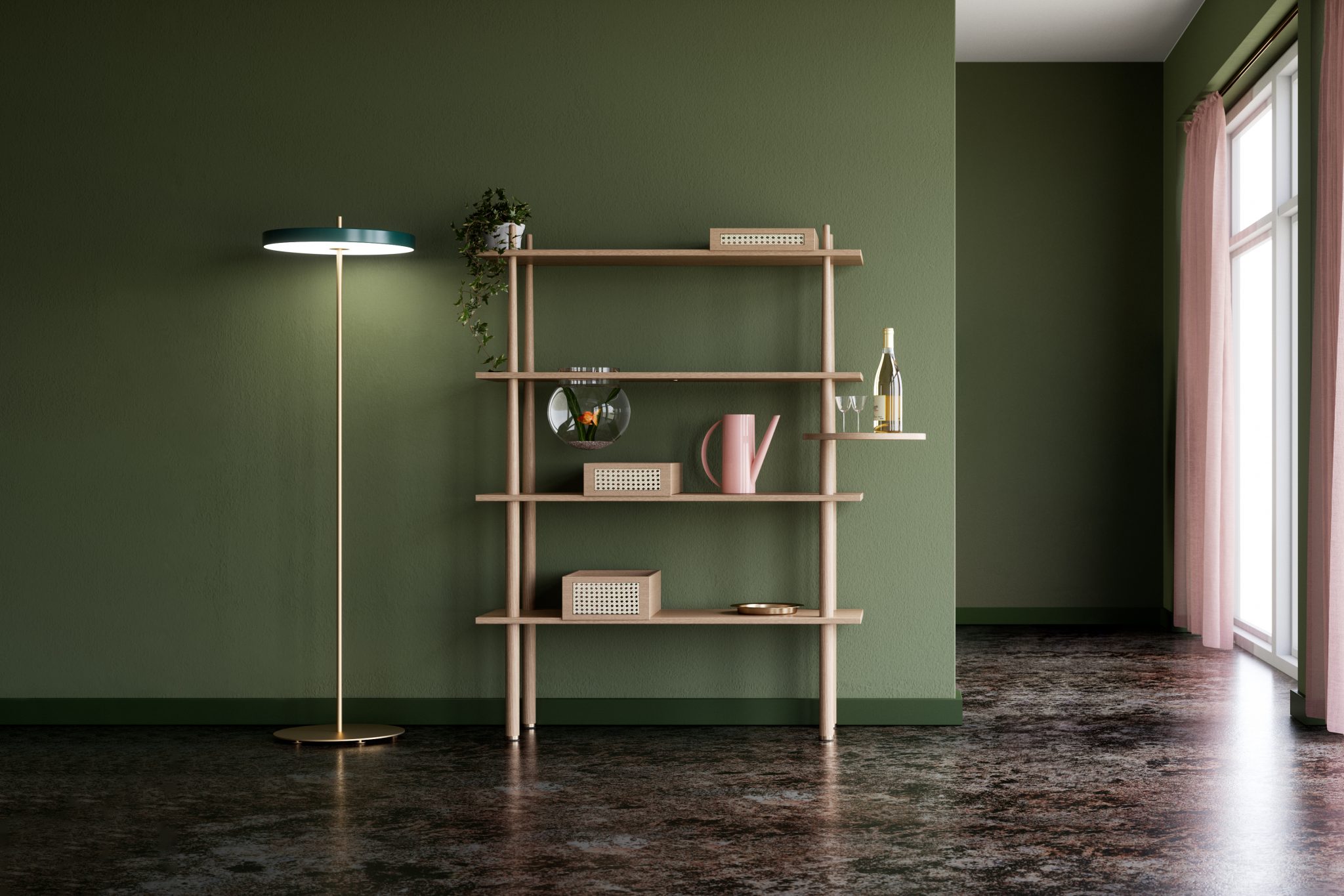 Stories er en fleksibel hylleenhet, der du kan sette inn de tingene du elsker mest. Stories består av 4 hyller, hvor den ene har et hull der man kan kjøpe tilleggsprodukter, som vase, messingplate osv.