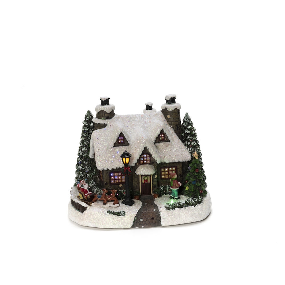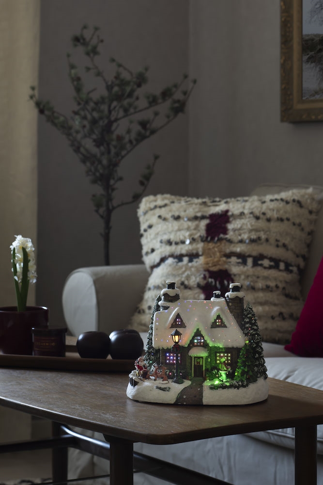 Fiberoptisk hus med 5 fargede LED. Dekorasjonen kan brukes både med transformator (medfølger) og på batteri.
