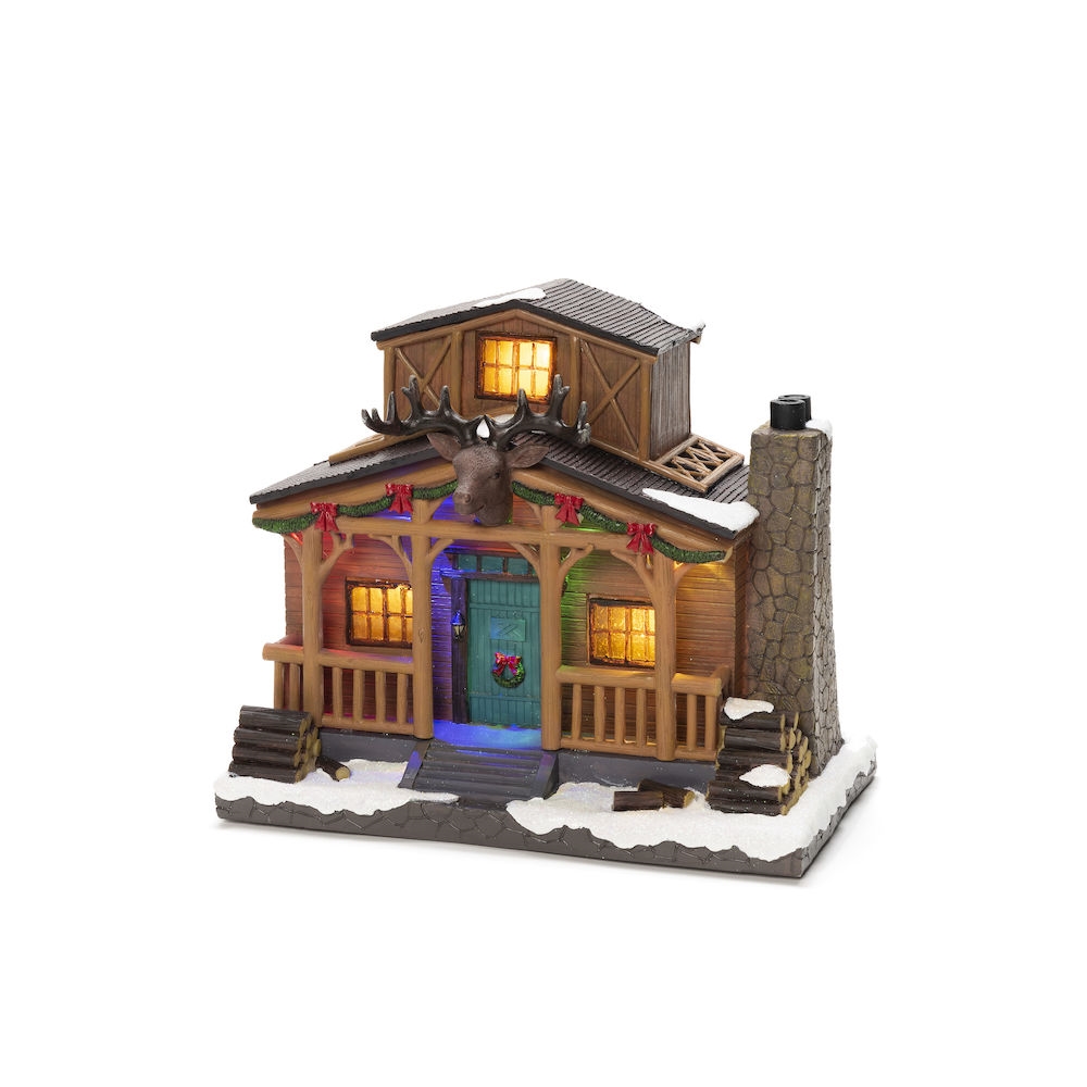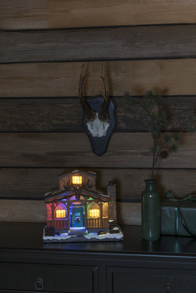 Dekorasjon vinterhytte med 6 fargede LED. Dekorasjonen kan brukes både med trafo (medfølger) og på batteri.