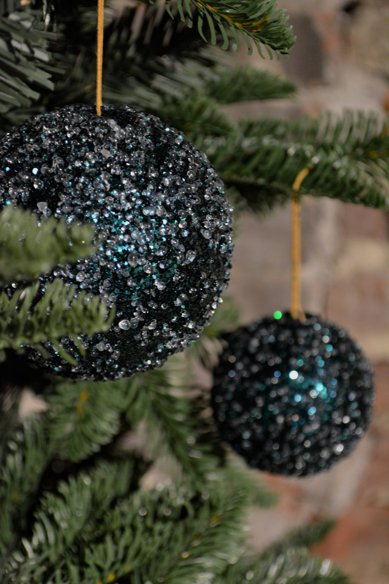 Dekorativ julekule med glitter i en blå og grønn nyanse. Skinn snor til å henge den opp med.