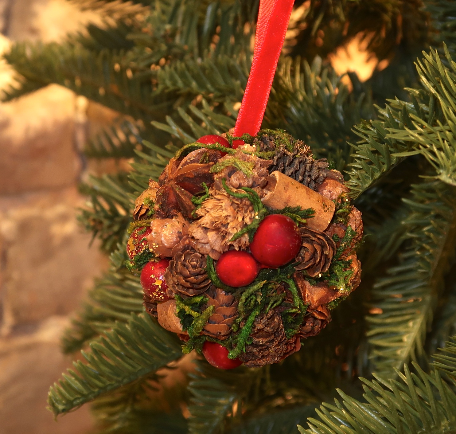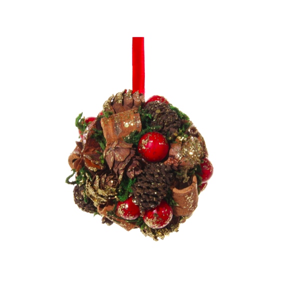 Dekorativ julekule med rødt velour bånd med kongler og røde bær.