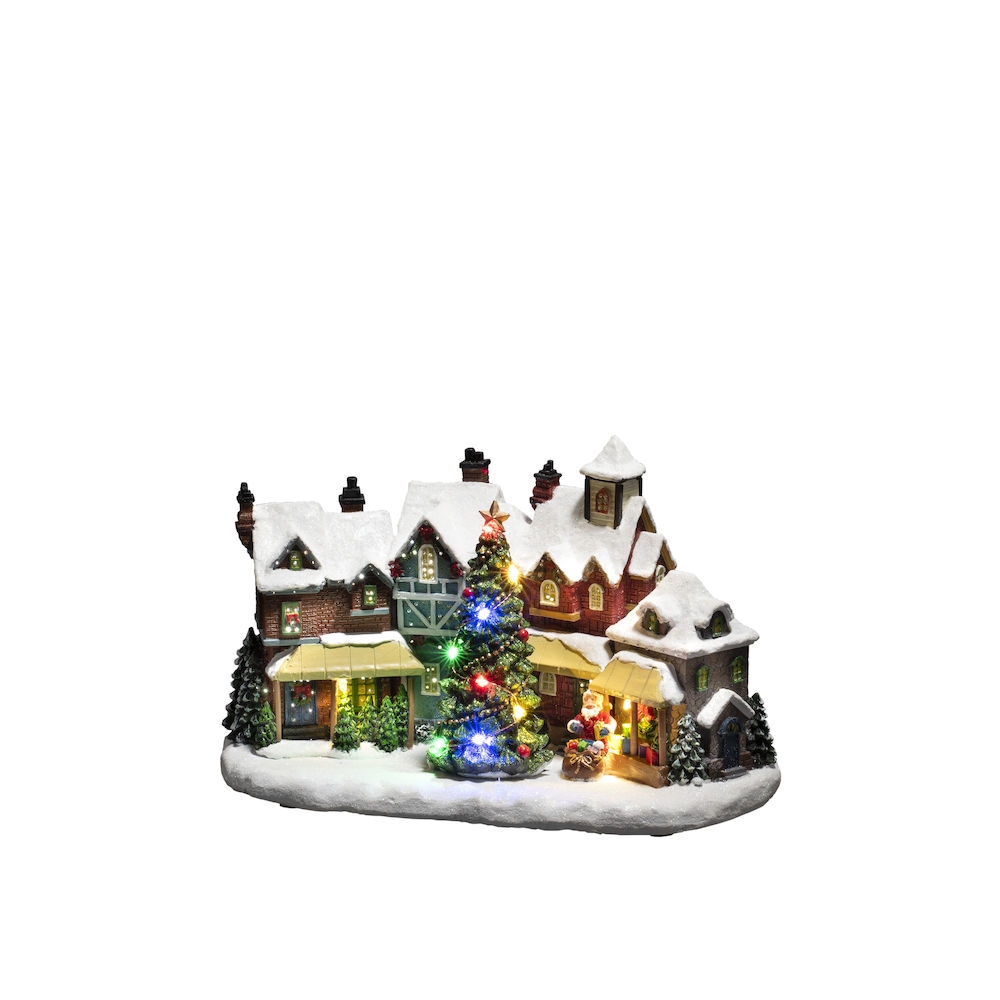 Mekanisk juleby med 13 fargede LED og musikk. Dobbeltfunksjon med transformator (medfølger) og batteri.