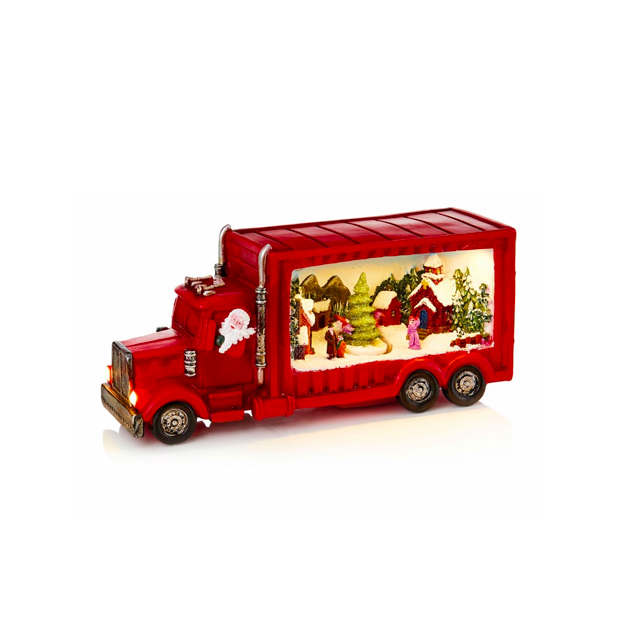 Lastebil med lys. Juletreet inne i lastebilen roterer og hele lasterommet er opplyst. Frontlyktene lyser også. Batteridrevet så lett å plassere uten å måtte ta hensyn til ledninger.