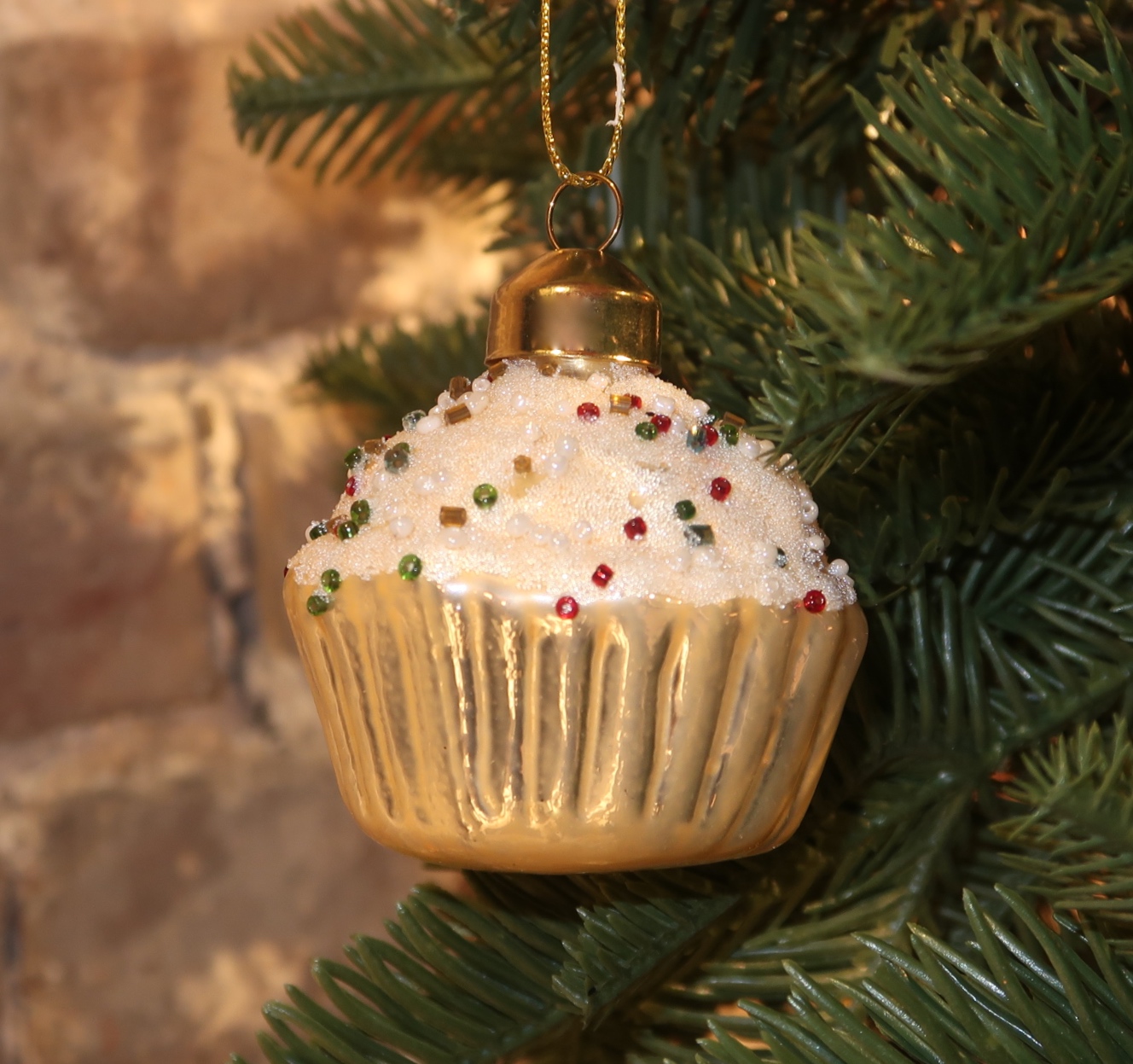 Dekorativ muffins med pynt til å henge på juletreet.